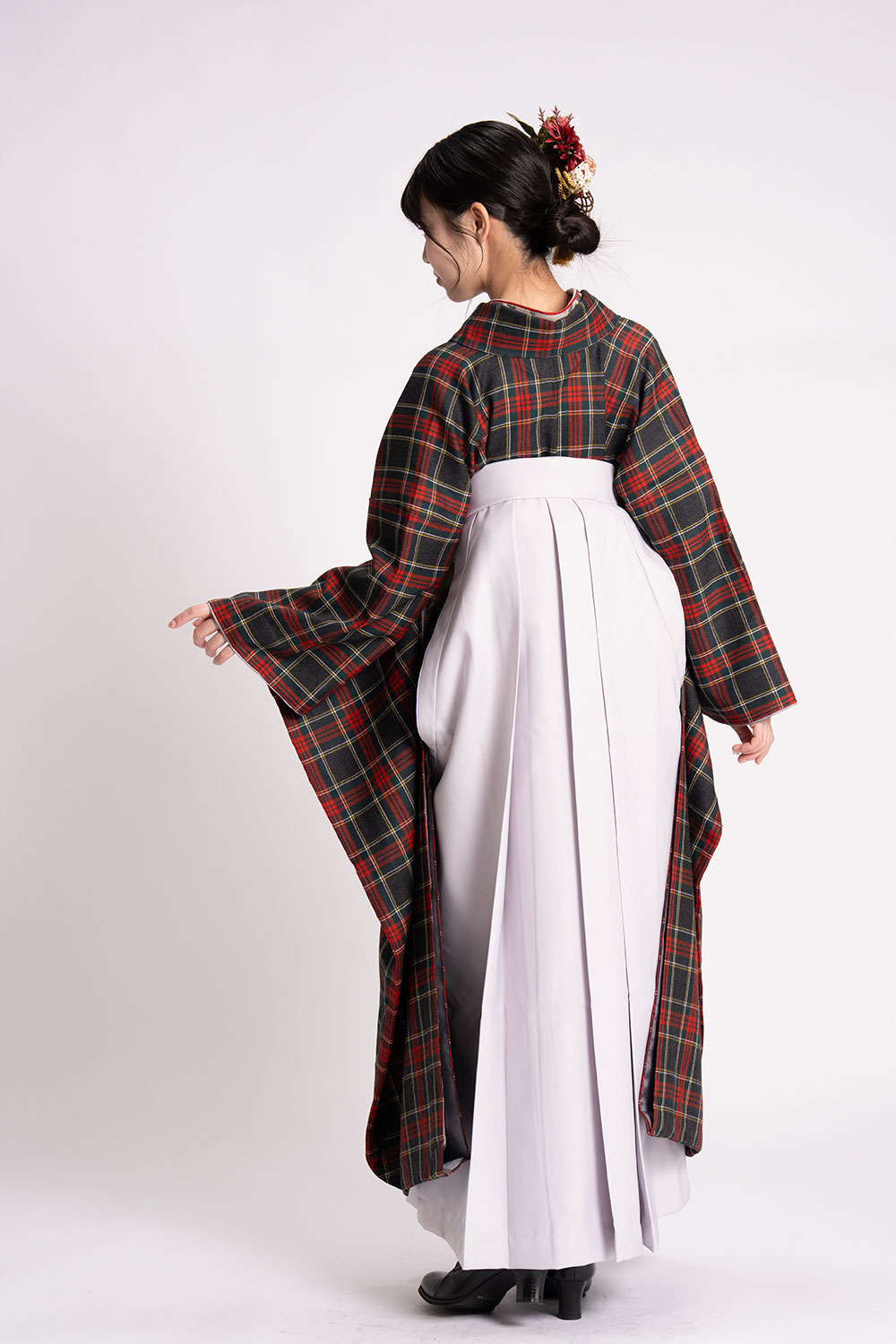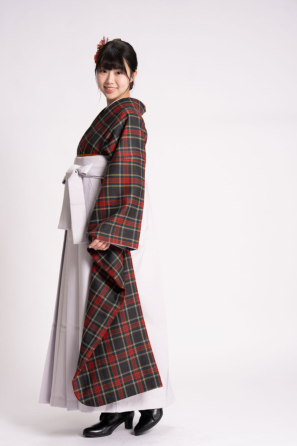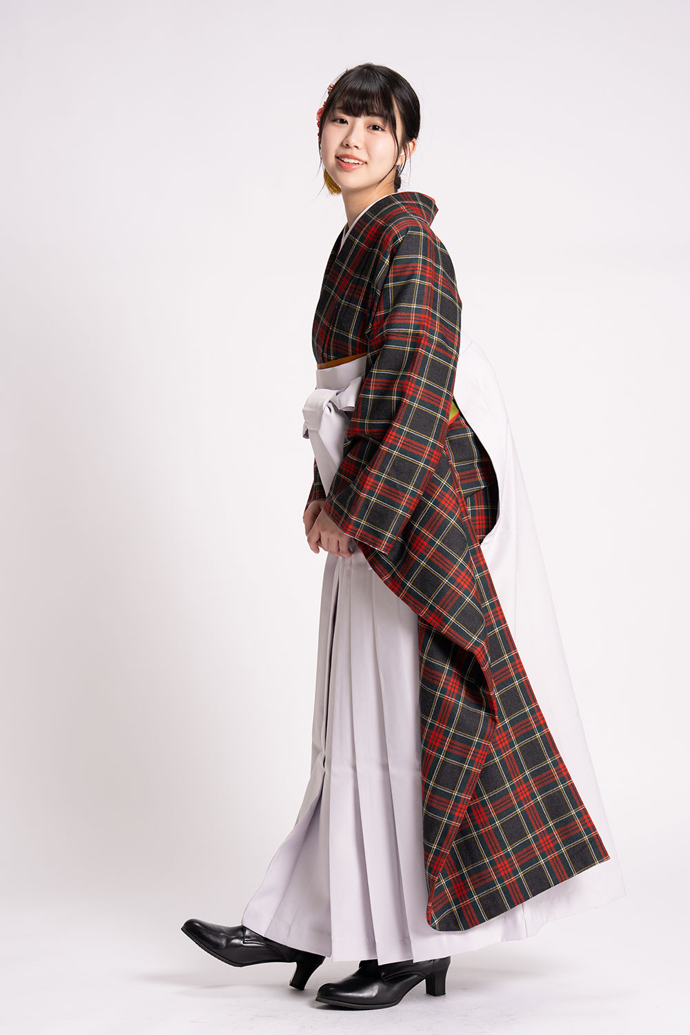 【対応身長 150cm~157cm】【キュート】卒業式レンタル袴フルセット-2144【振袖タイプ】 夢助 【振袖タイプ】 タータンチェック柄 ウール素材 グレー 無地袴 グレー