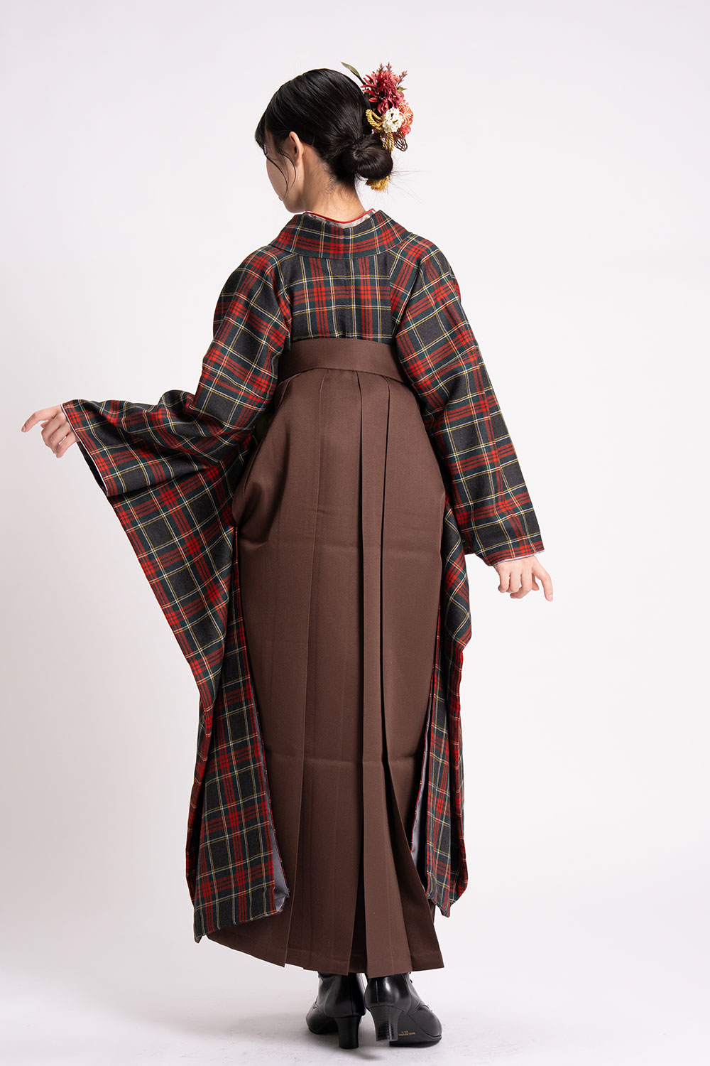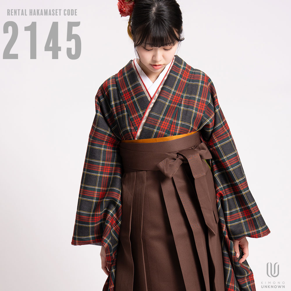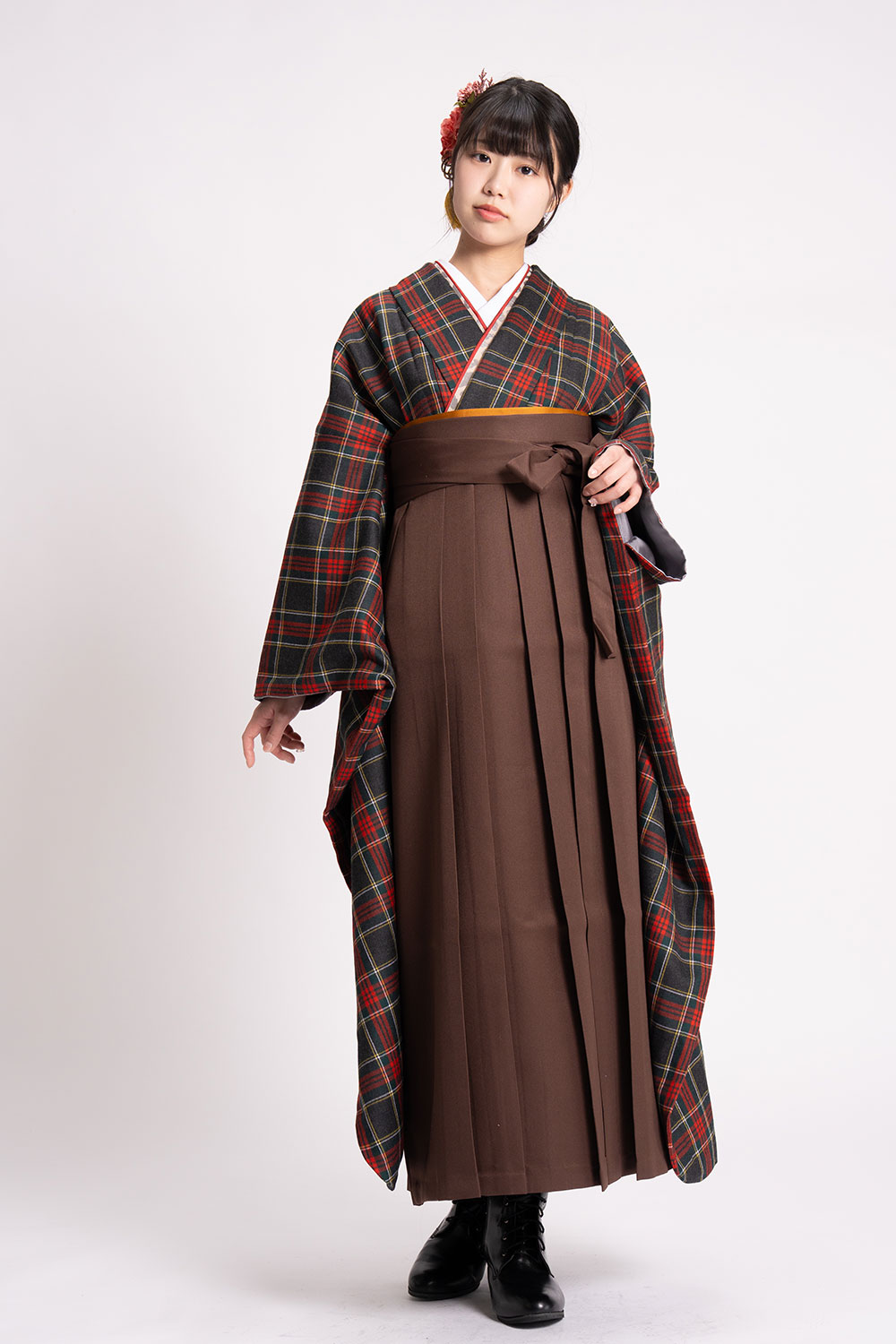 【対応身長 150cm~157cm】【キュート】卒業式レンタル袴フルセット-2145【振袖タイプ】 夢助 【振袖タイプ】 タータンチェック柄 ウール素材 グレー 無地袴 ブラウン