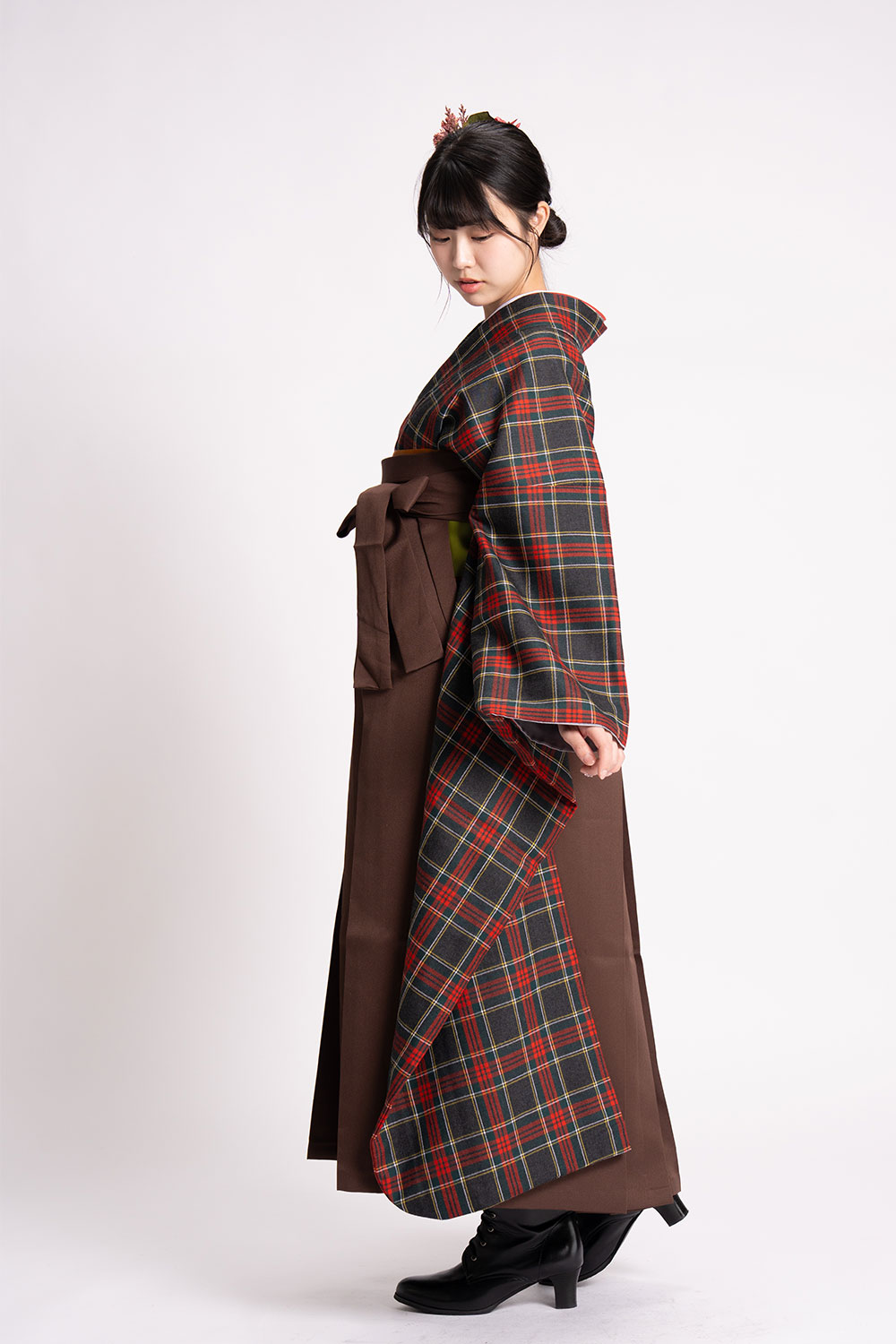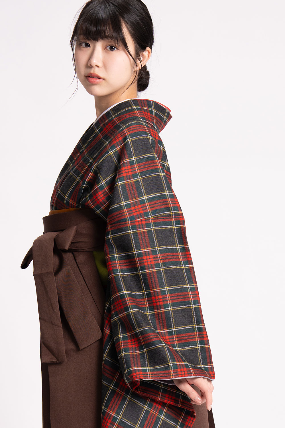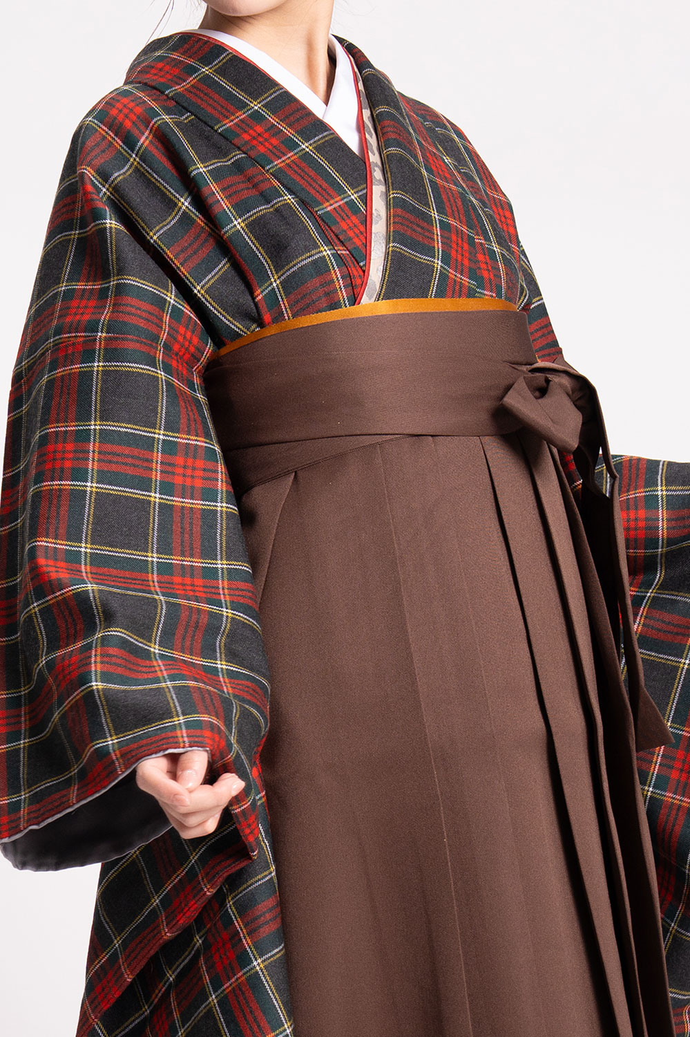 【対応身長 150cm~157cm】【キュート】卒業式レンタル袴フルセット-2145【振袖タイプ】 夢助 【振袖タイプ】 タータンチェック柄 ウール素材 グレー 無地袴 ブラウン