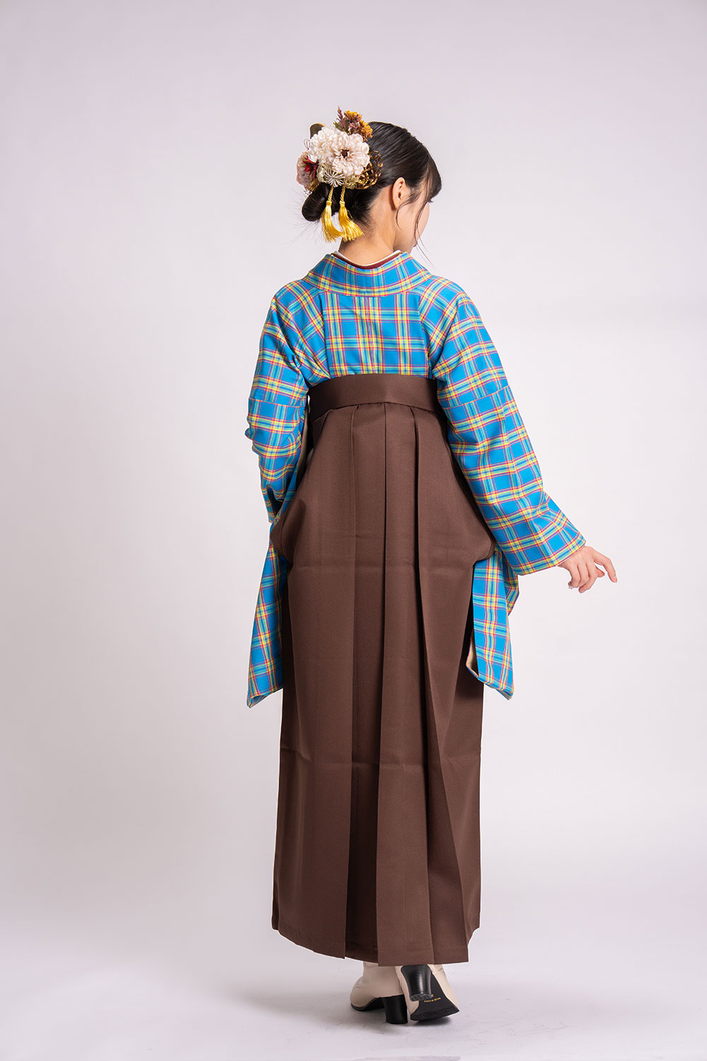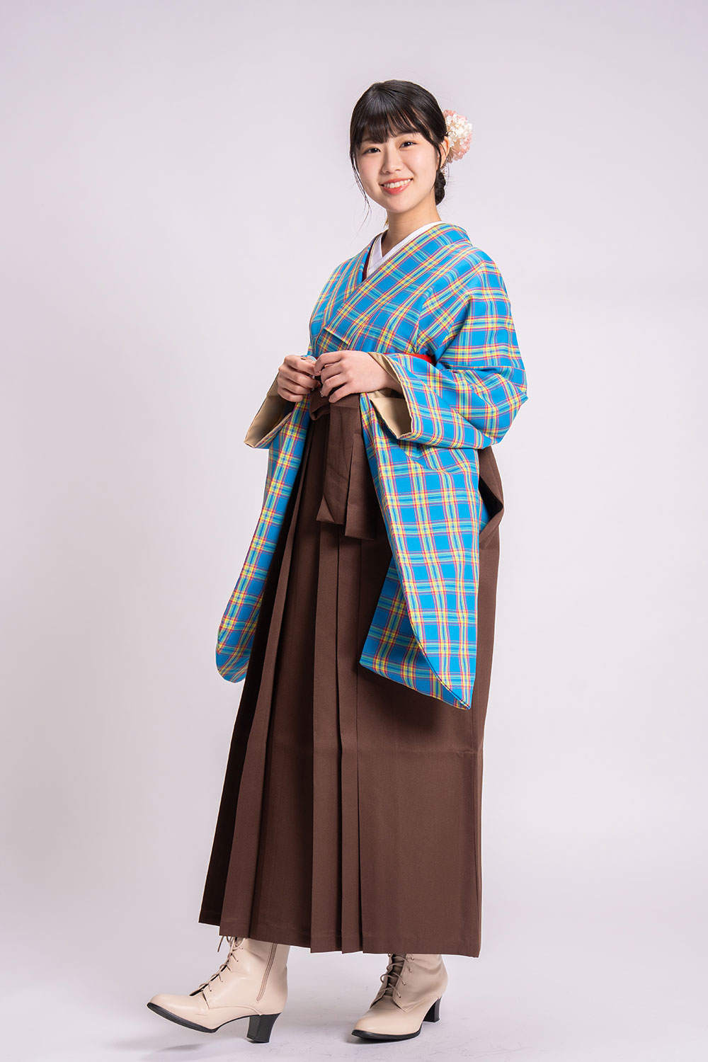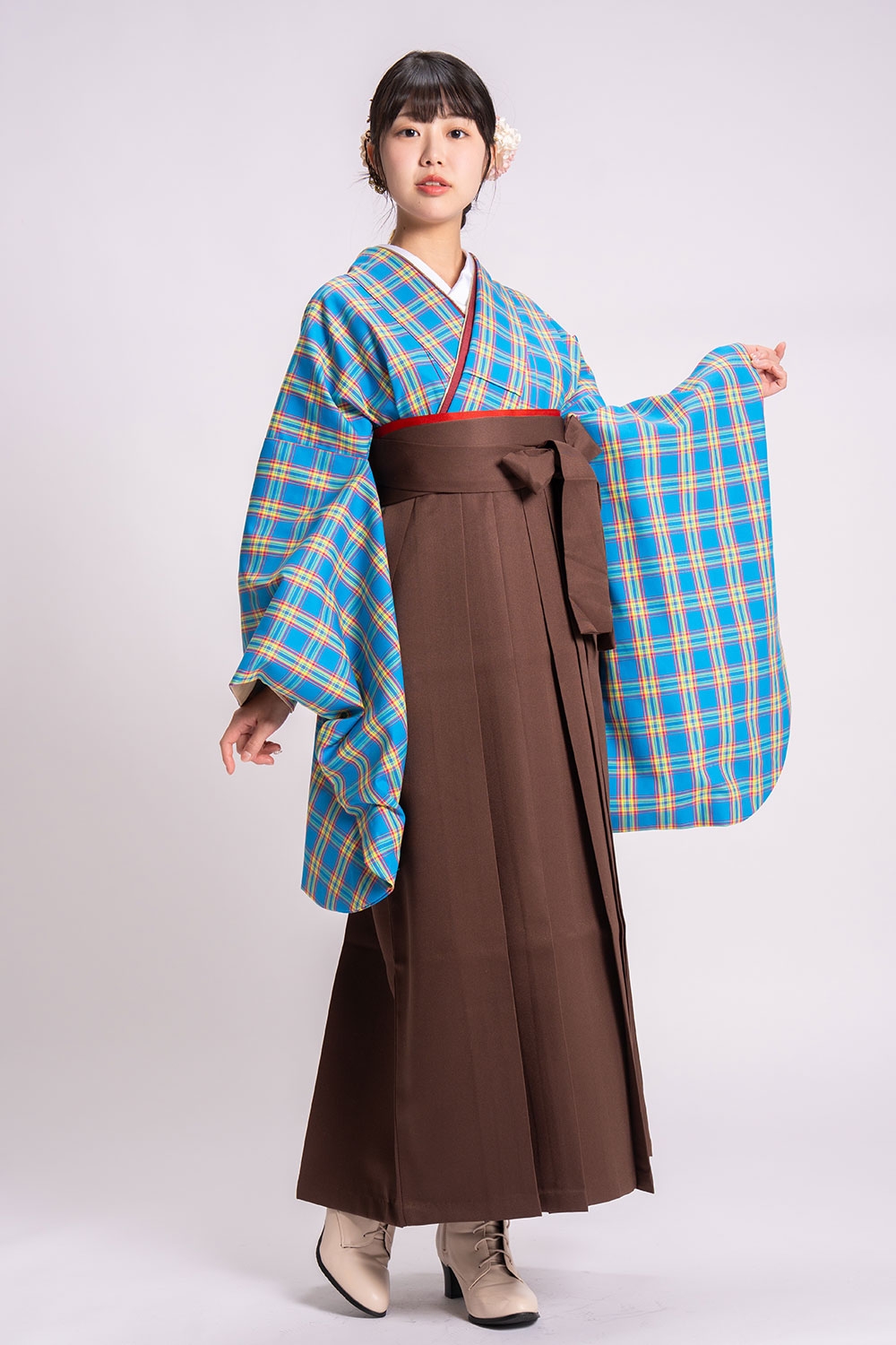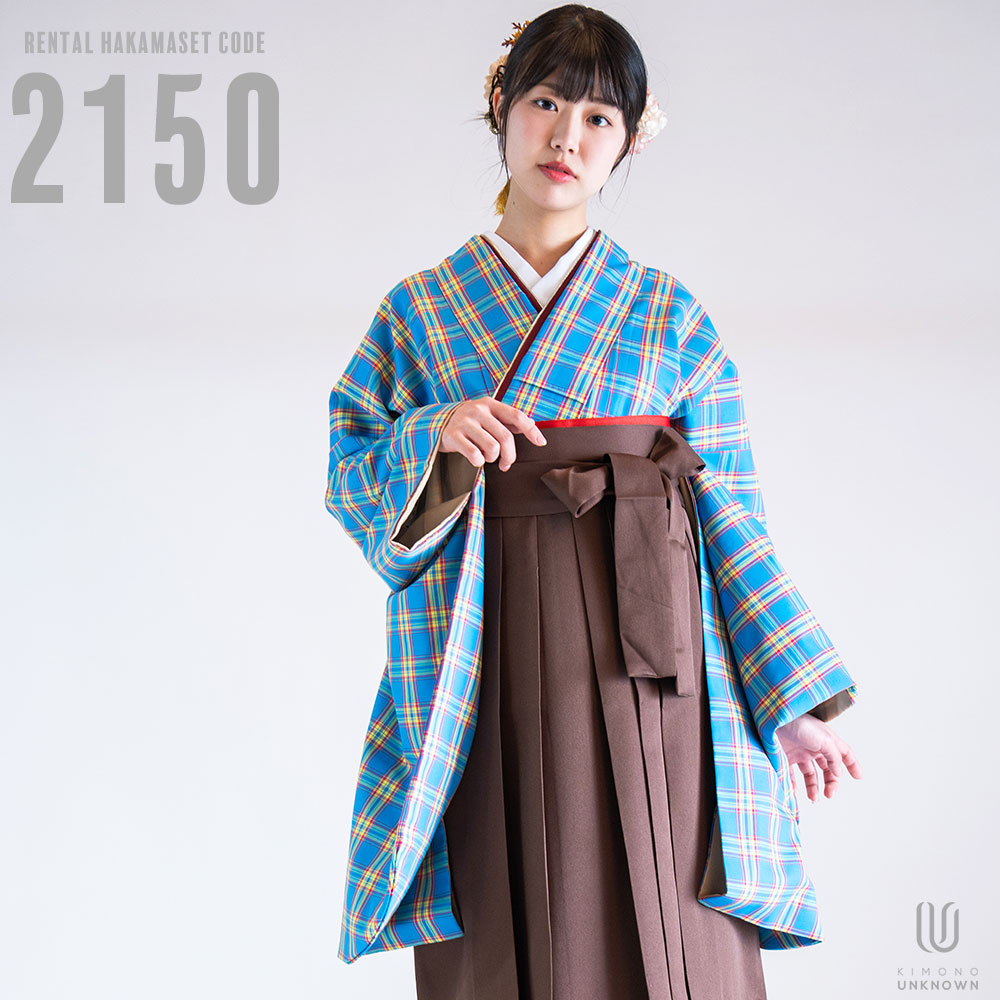 【対応身長 150cm~157cm】【キュート】卒業式レンタル袴フルセット2150【二尺袖タイプ】 夢助 チェック 水色 無地袴 ブラウン