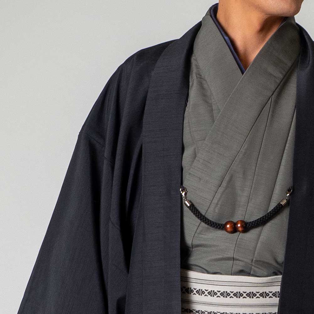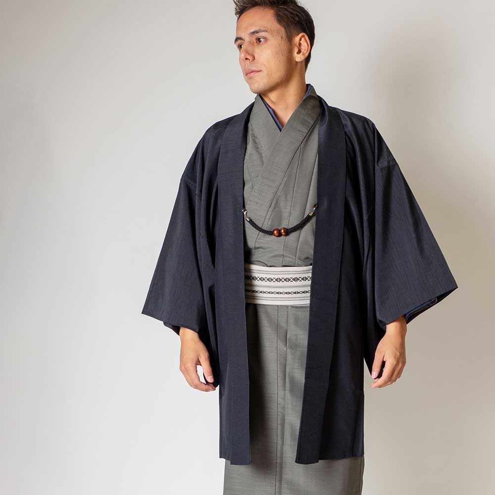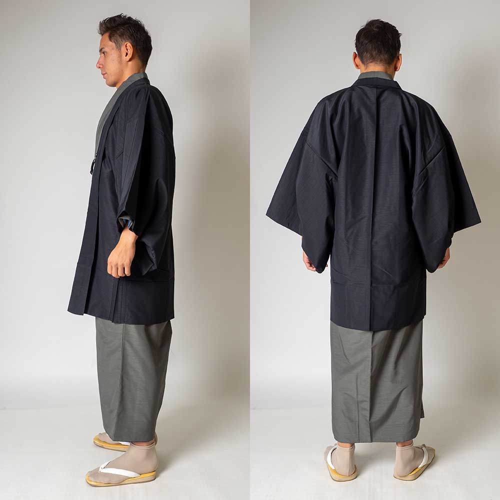 メンズ着物アンサンブル【対応身長180cm~190cm】【 3Lサイズ】フルセットー着物グレー×羽織ブラック 着流し 羽織 パパ着物 父親 春 秋 冬 着付け簡単 おしゃれ着 カジュアル 貸衣装 レンタル衣