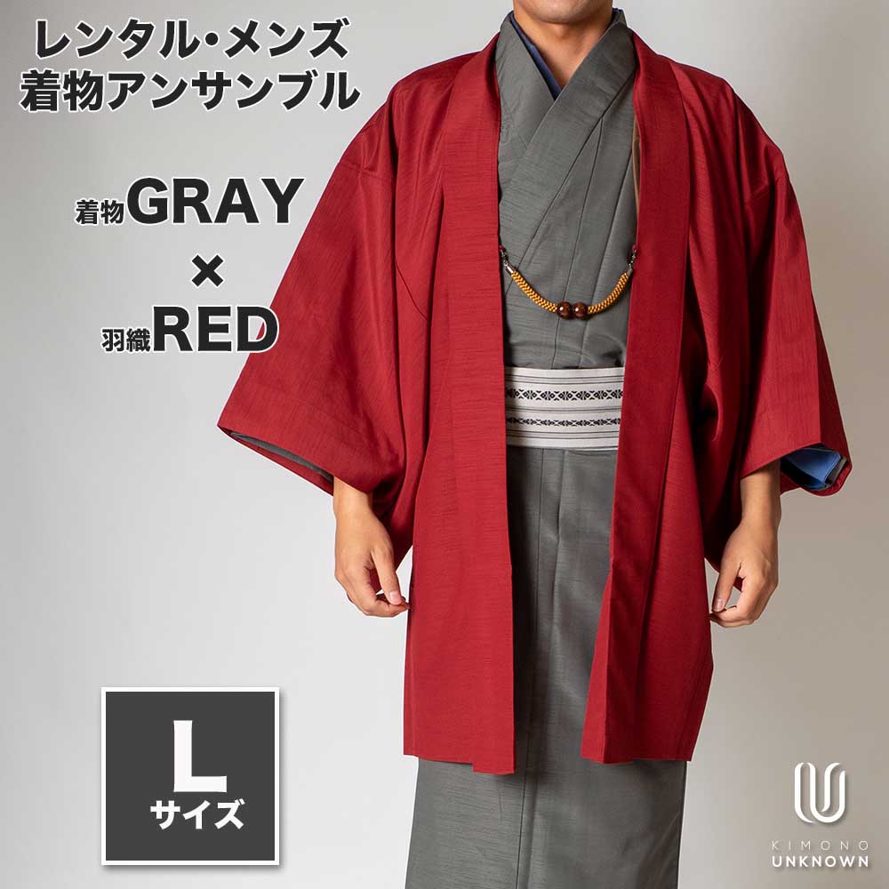 メンズ着物アンサンブル【対応身長170cm~180cm】【 Lサイズ】フルセットー着物グレー×羽織レッド 春 秋 冬 おしゃれ着 カジュアル 貸衣装 レンタル衣裳 七五三 お正月 初詣