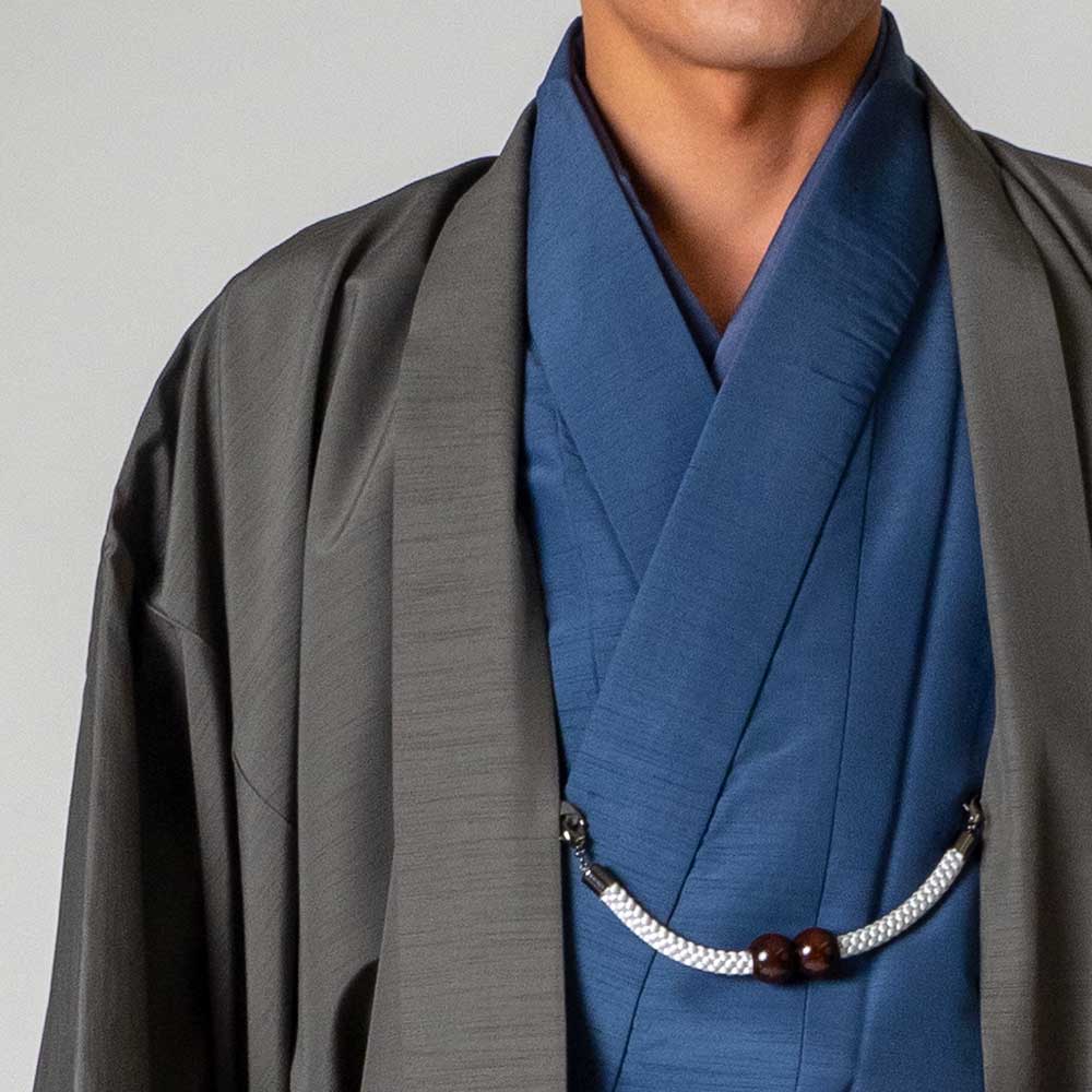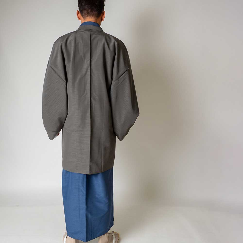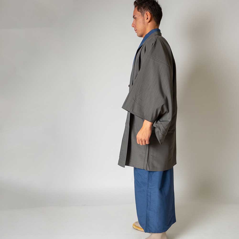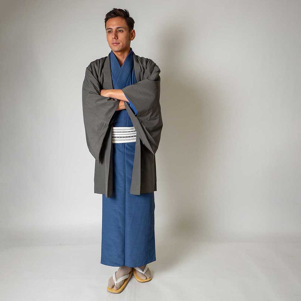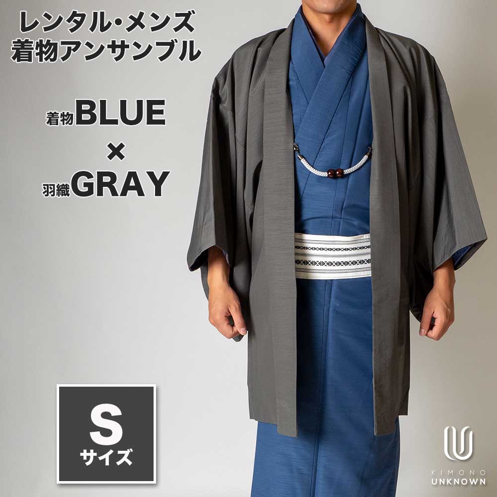 メンズ着物アンサンブル【対応身長160cm~170cm】【 Sサイズ】フルセットー着物ブルー×羽織グレー 春 秋 冬 おしゃれ着 カジュアル 貸衣装 レンタル衣裳 七五三 お正月 初詣