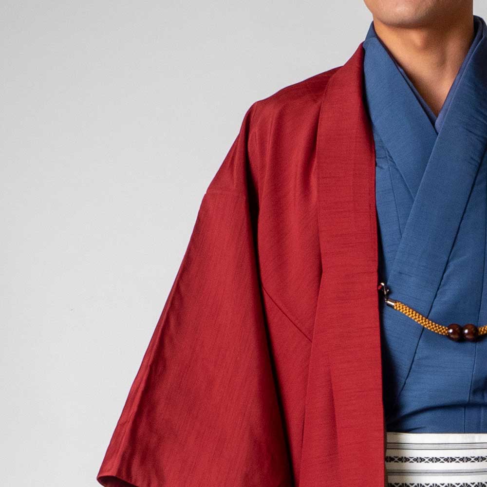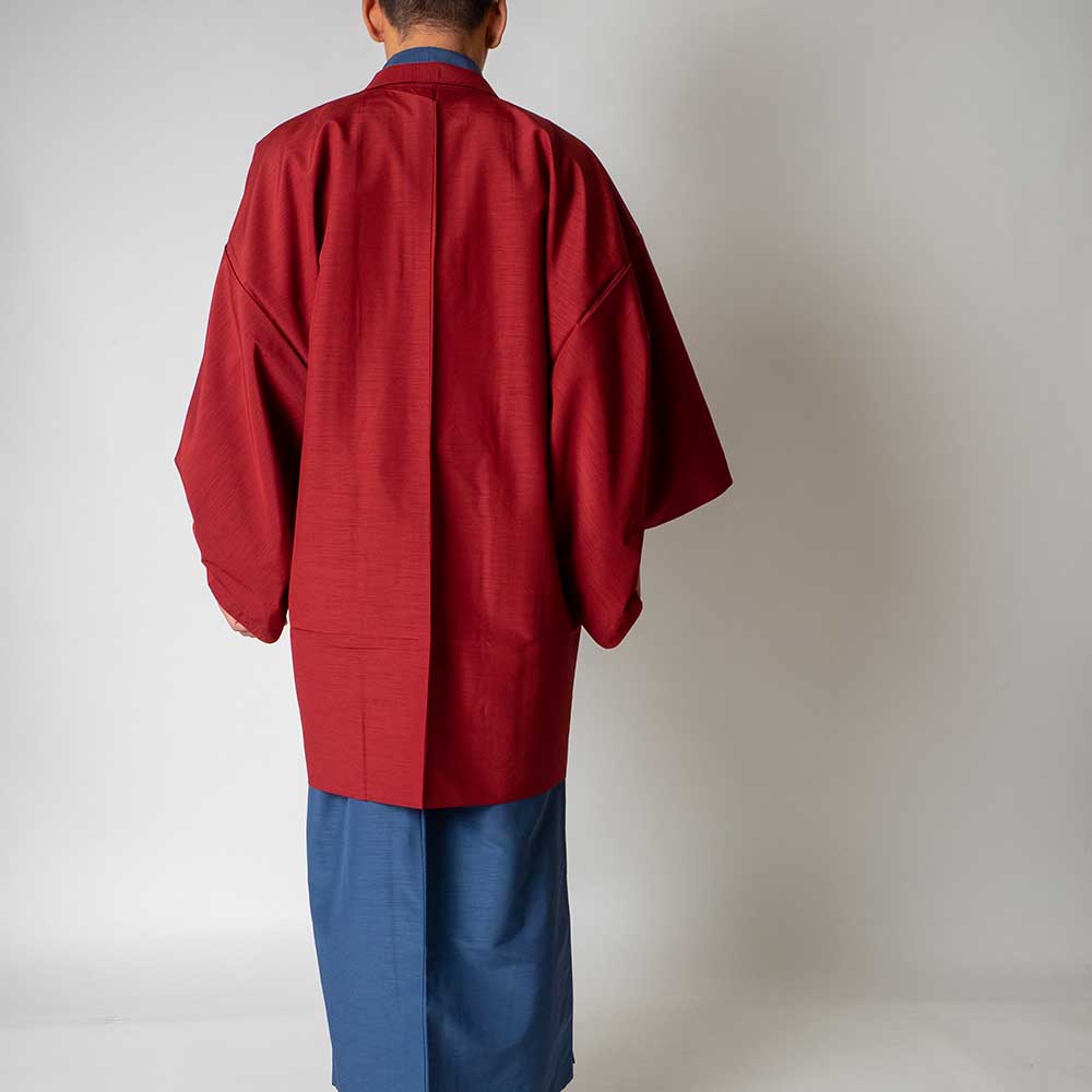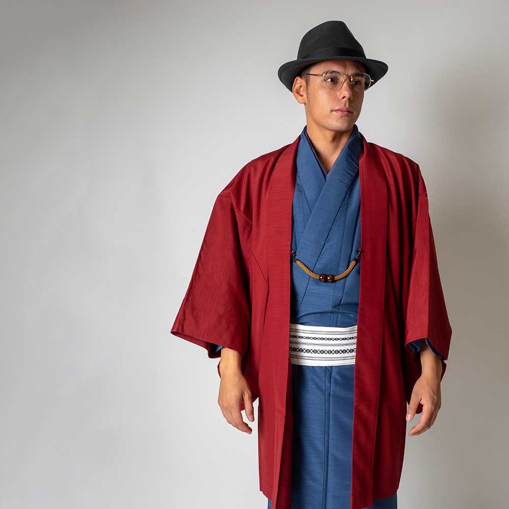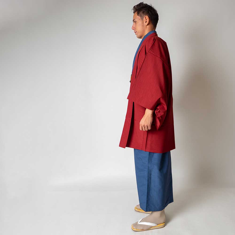 メンズ着物アンサンブル【対応身長165cm~175cm】【 Mサイズ】フルセットー着物ブルー×羽織レッド 春 秋 冬 おしゃれ着 カジュアル 貸衣装 レンタル衣裳 七五三 お正月 初詣