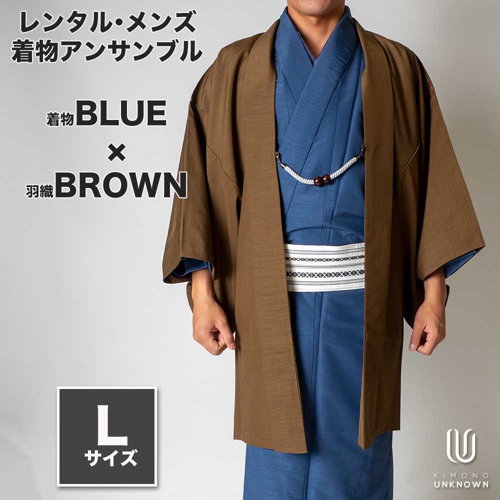 メンズ着物アンサンブル【対応身長170cm~180cm】【 Lサイズ】フルセットー着物ブルー×羽織ブラウン 着流し 羽織 パパ着物 父親 春 秋 冬 着付け簡単 おしゃれ着 カジュアル 貸衣装 レンタル衣裳