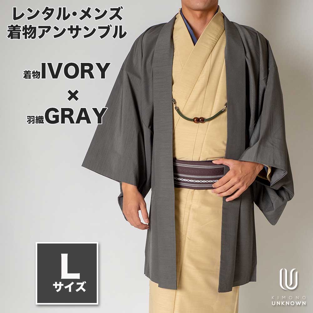 メンズ着物アンサンブル【対応身長170cm~180cm】【 Lサイズ】フルセットー着物アイボリー×羽織グレー 着流し 羽織 パパ着物 父親 春 秋 冬 着付け簡単 カジュアル 貸衣装 レンタル衣裳 七五三 お正月 初詣 旅行 食事会 和装 男性用着物