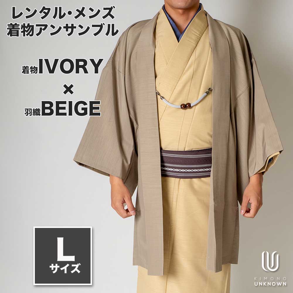 メンズ着物アンサンブル【対応身長170cm~180cm】【 Lサイズ】フルセットー着物アイボリー×羽織ベージュ 羽織 パパ着物 父親用 春用 秋用 冬用 着付け簡単 おしゃれ カジュアル 和装 貸衣装 レンタル衣裳 七五三 お正月 初詣 旅行 食事会