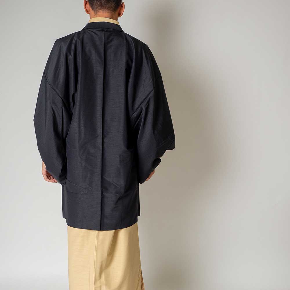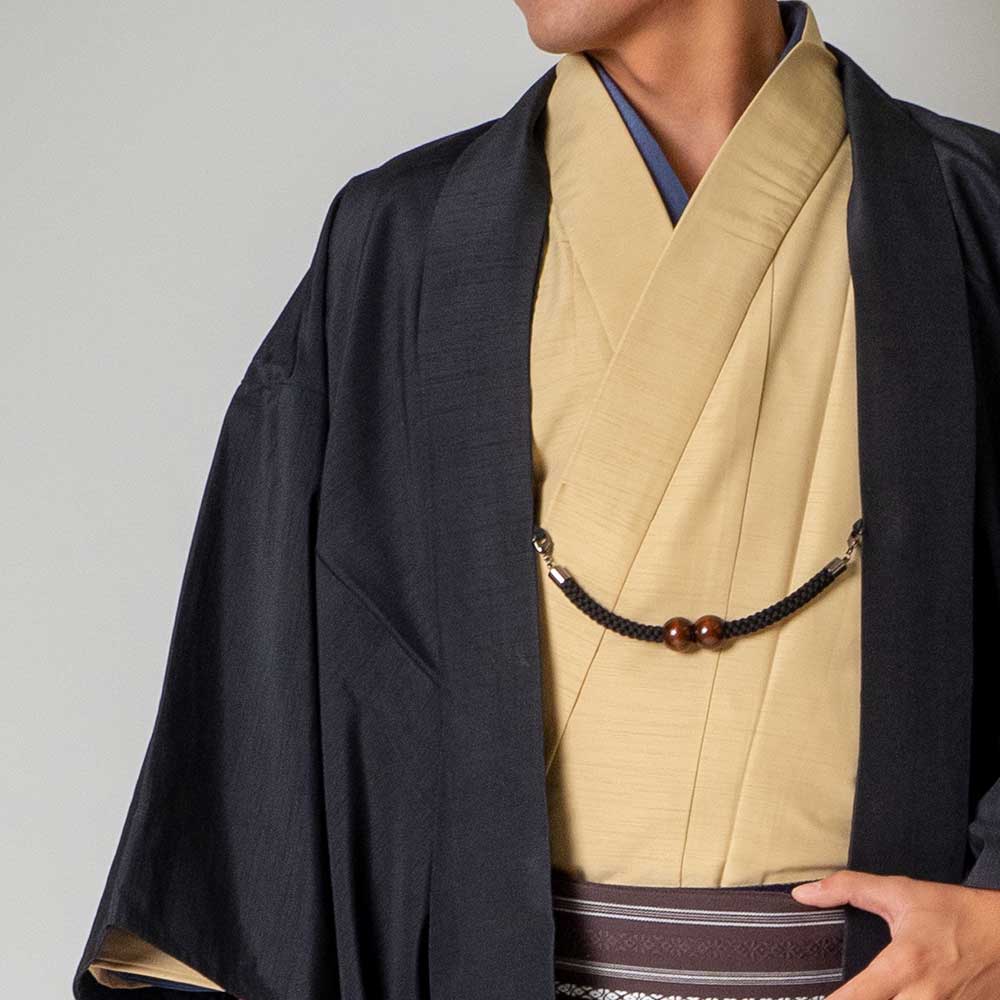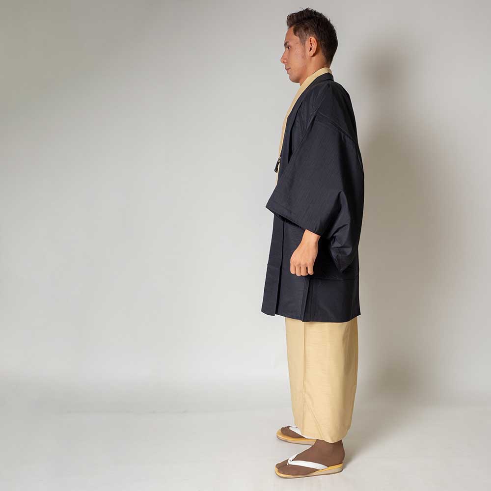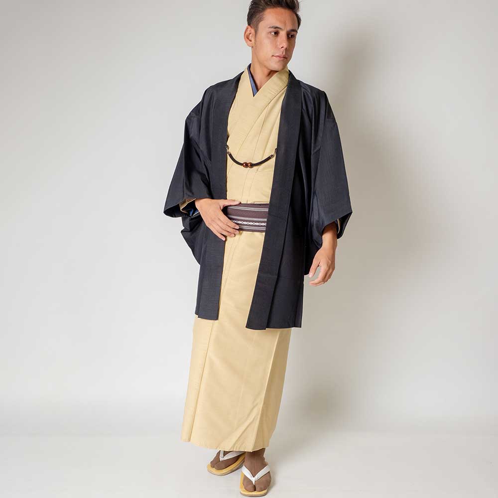 メンズ着物アンサンブル【対応身長165cm~175cm】【 Mサイズ】フルセットー着物アイボリー×羽織ブラック 着流し 羽織 パパ着物 父親 春 秋 冬 着付け簡単 おしゃれ着 カジュアル 貸衣装 レンタル