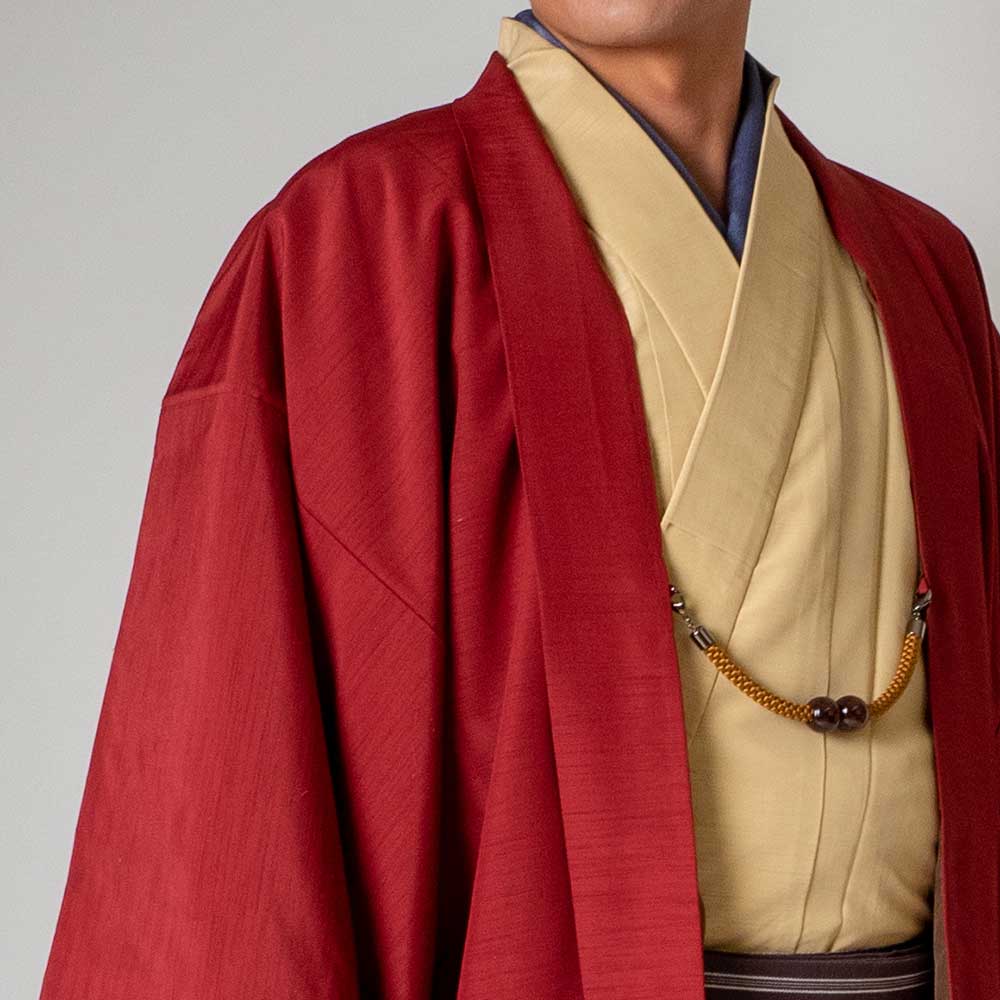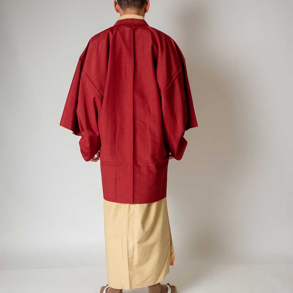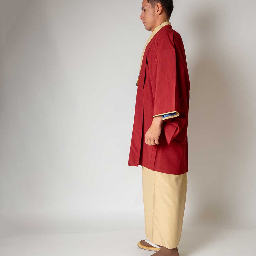 メンズ着物アンサンブル【対応身長175cm~185cm】【 LLサイズ】フルセットー着物アイボリー×羽織レッド 着流し 羽織 パパ着物 父親 春 秋 冬 着付け簡単 おしゃれ着 カジュアル 貸衣装 レンタル