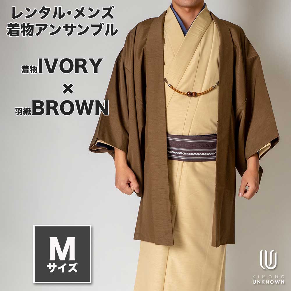 メンズ着物アンサンブル【対応身長165cm~175cm】【 Mサイズ】フルセットー着物アイボリー×羽織ブラウン 着流し 羽織 パパ着物 父親 春 秋 冬 着付け簡単 おしゃれ着 カジュアル 貸衣装 レンタル
