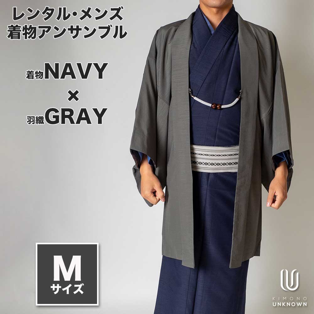 メンズ着物アンサンブル【対応身長165cm~175cm】【 Mサイズ】フルセットー着物ネイビー×羽織グレー 着流し 羽織 パパ着物 父親 春 秋 冬 着付け簡単 おしゃれ着 カジュアル 貸衣装 レンタル衣裳