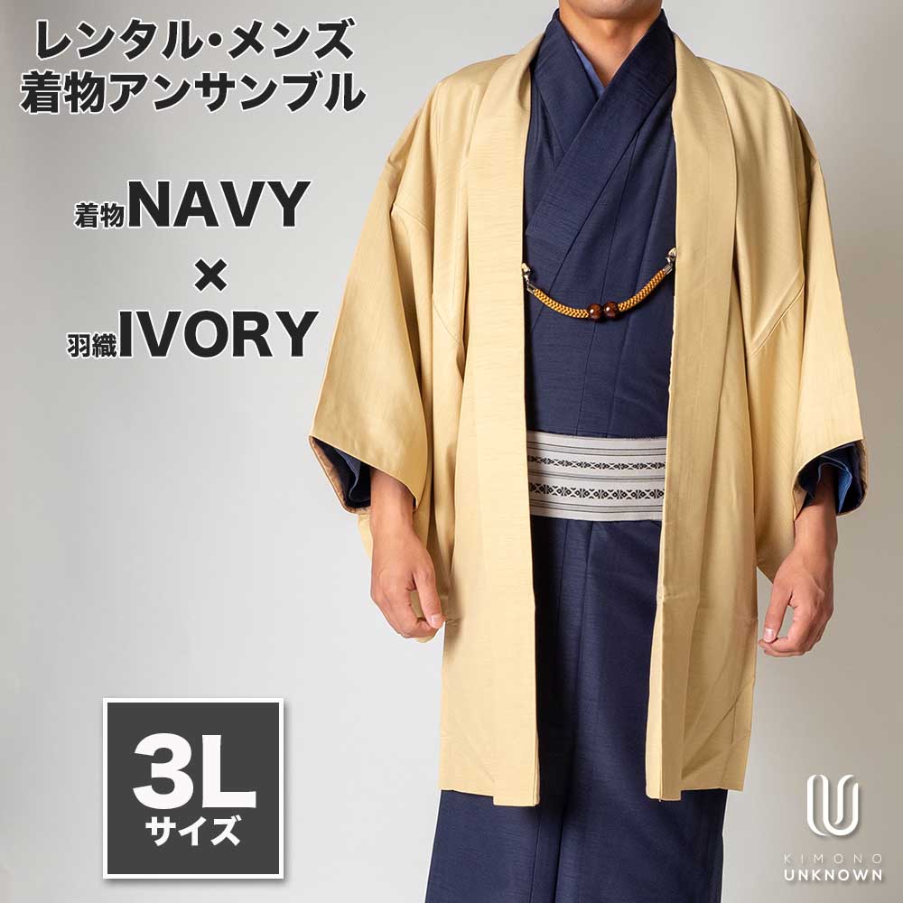 メンズ着物アンサンブル【対応身長180cm~190cm】【 3Lサイズ】フルセットー着物ネイビー×羽織アイボリー 着流し 羽織 パパ着物 父親 春 秋 冬 着付け簡単 おしゃれ着 カジュアル 貸衣装 レンタ