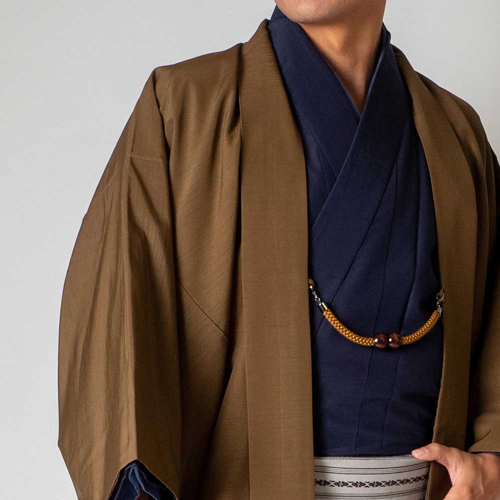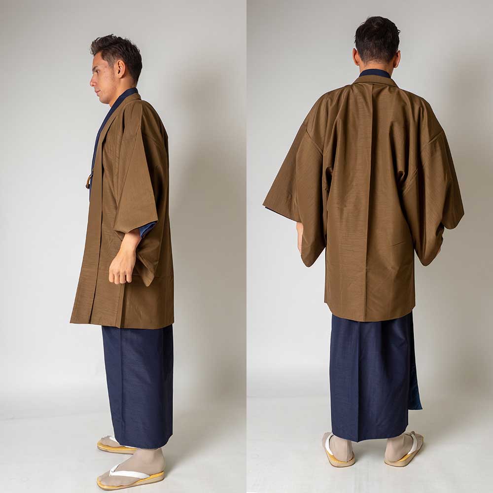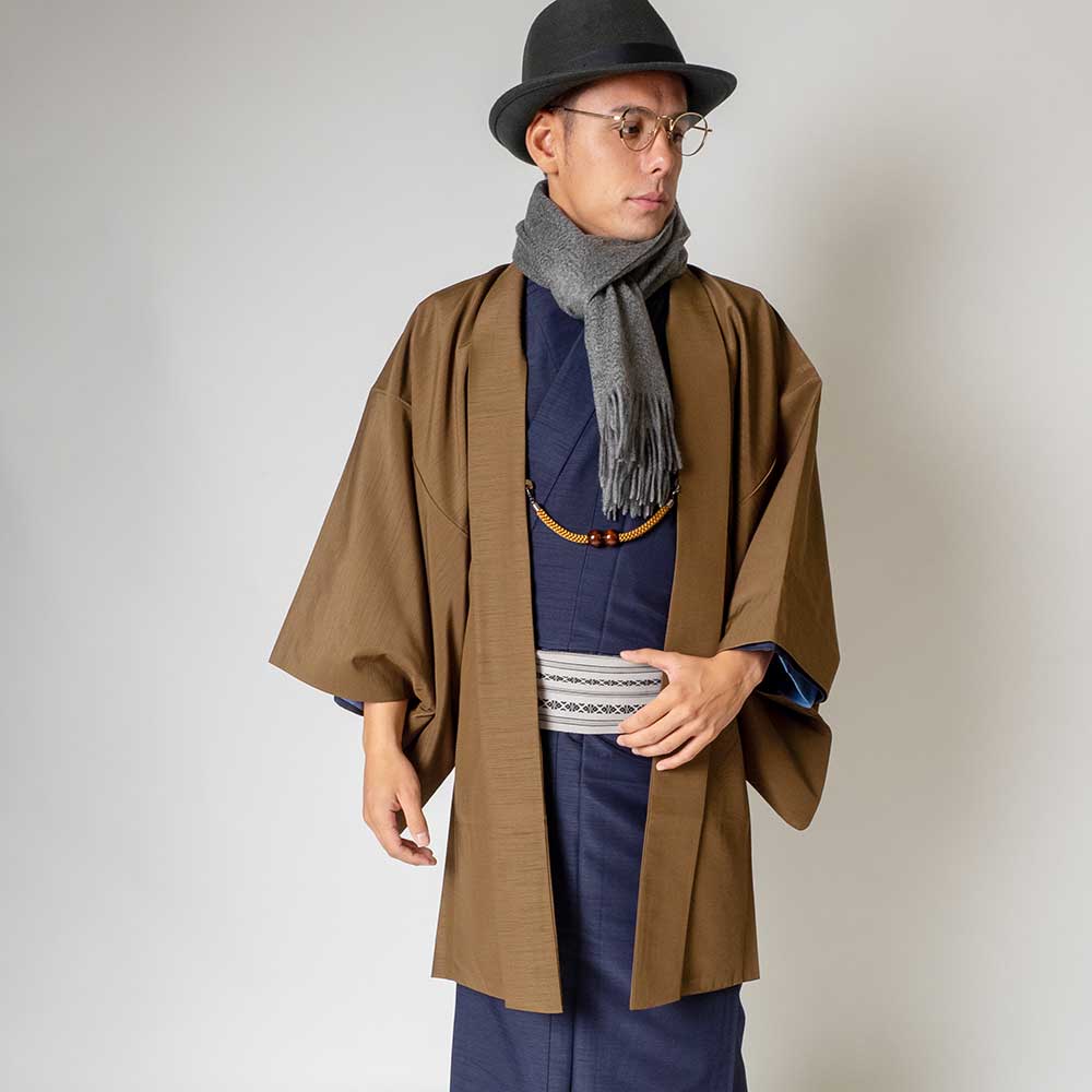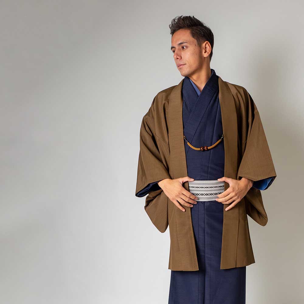 メンズ着物アンサンブル【対応身長160cm~170cm】【 Sサイズ】フルセットー着物ネイビー×羽織ブラウン 着流し 羽織 パパ着物 父親 春 秋 冬 着付け簡単 おしゃれ着 カジュアル 貸衣装 レンタル衣