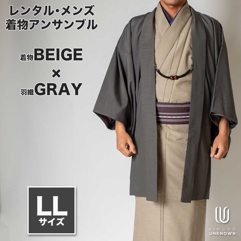 メンズ着物アンサンブル【対応身長175cm~185cm】【 LLサイズ】フルセットー着物ベージュ×羽織グレー 着流し 羽織 パパ着物 父親 春 秋 冬 着付け簡単 カジュアル 貸衣装 レンタル衣裳 七五三 お正月 初詣 旅行 食事会 男性 着物 一式
