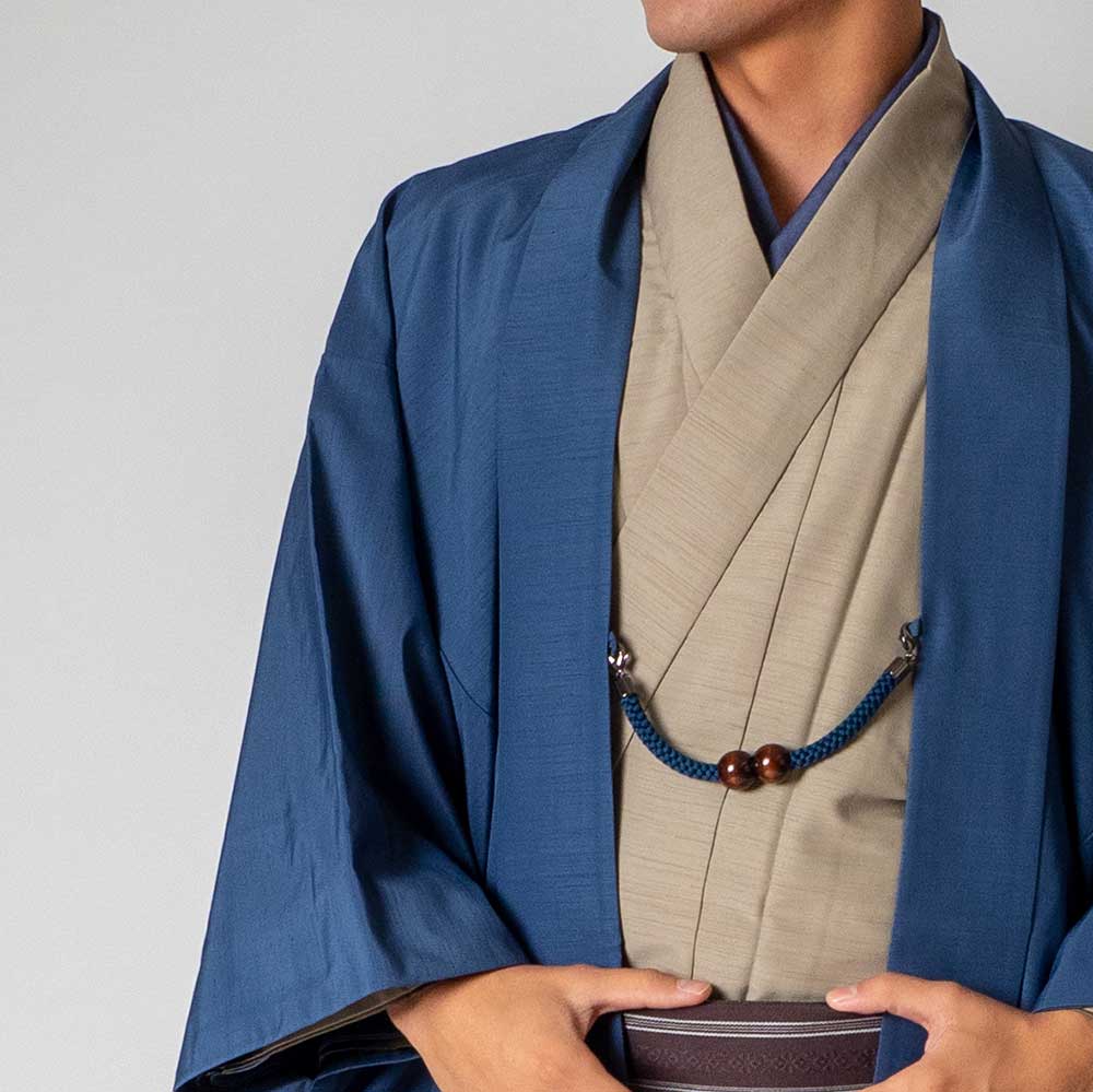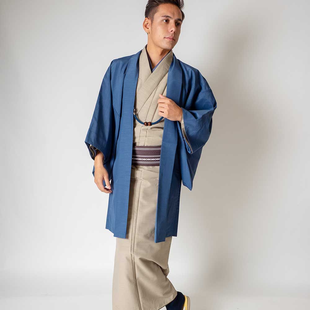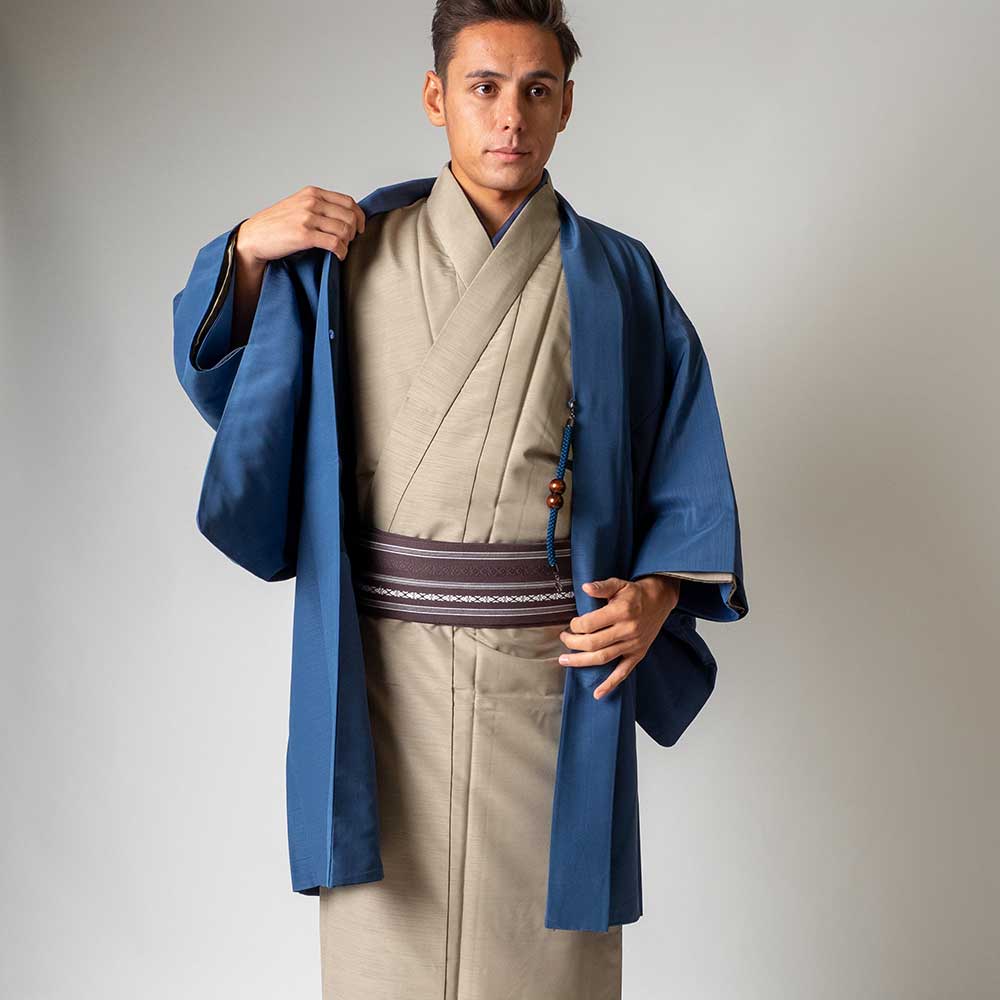 メンズ着物アンサンブル【対応身長165cm~175cm】【 Mサイズ】フルセットー着物ベージュ×羽織ブルー 着流し 羽織 パパ着物 父親 春 秋 冬 着付け簡単 おしゃれ着 カジュアル 貸衣装 レンタル衣裳