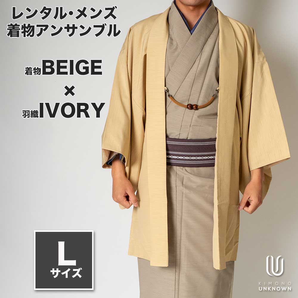 メンズ着物アンサンブル【対応身長170cm~180cm】【 Lサイズ】フルセットー着物ベージュ×羽織アイボリー 着流し 羽織 パパ着物 父親 春 秋 冬 着付け簡単 おしゃれ着 カジュアル 貸衣装 レンタル