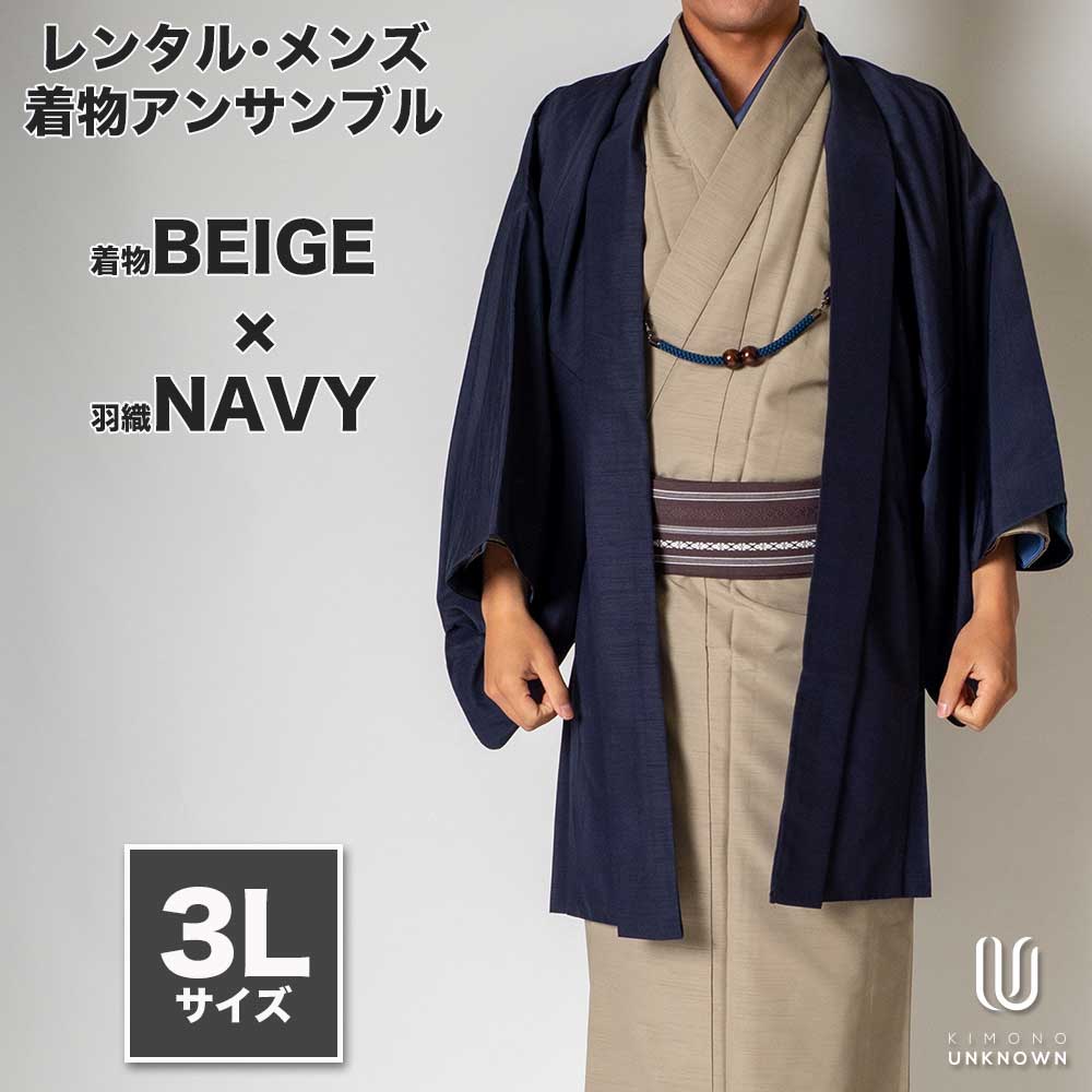 メンズ着物アンサンブル【対応身長180cm~190cm】【 3Lサイズ】フルセットー着物ベージュ×羽織ネイビー 着流し 羽織 パパ着物 父親 春 秋 冬 着付け簡単 おしゃれ着 カジュアル 貸衣装 レンタル