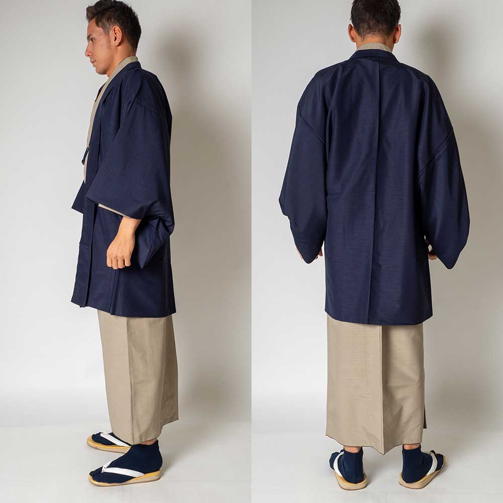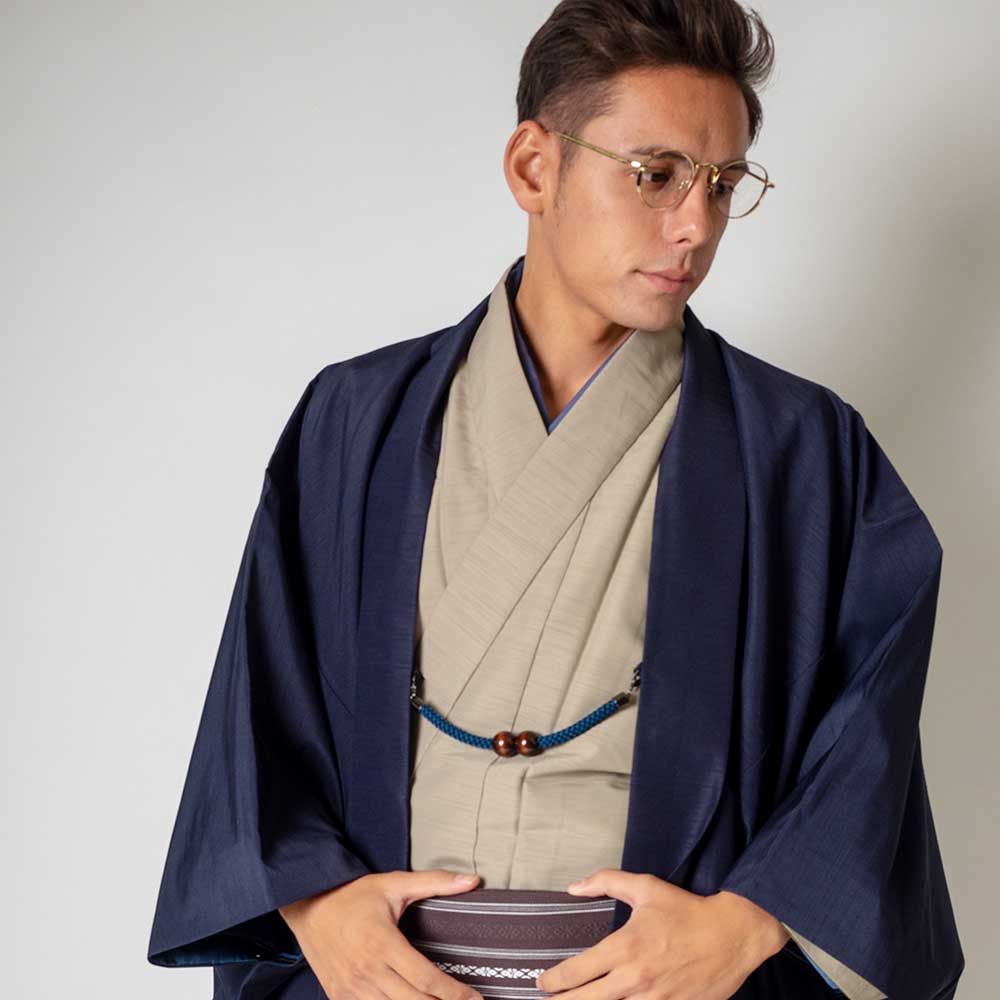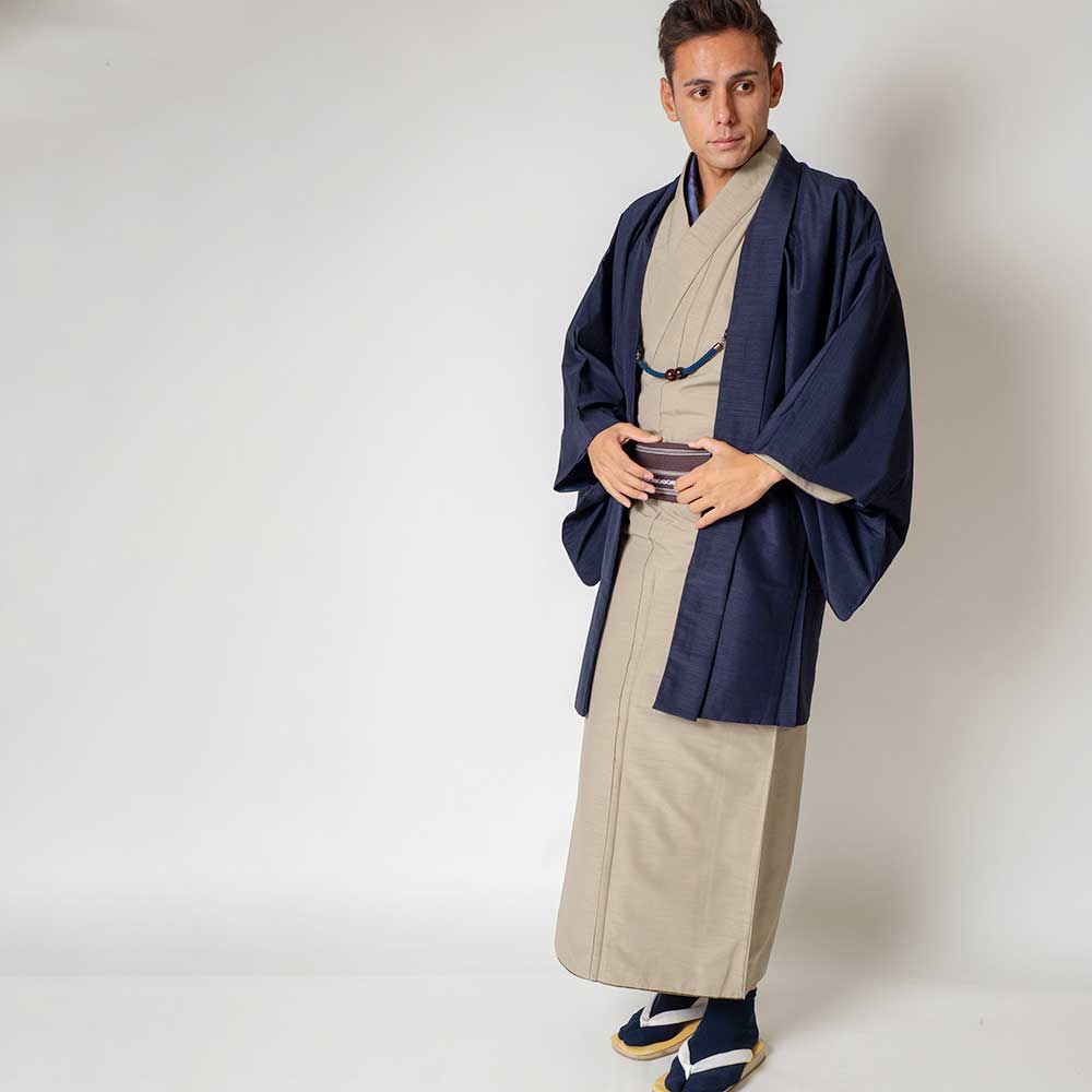メンズ着物アンサンブル【対応身長165cm~175cm】【 Mサイズ】フルセットー着物ベージュ×羽織ネイビー 着流し 羽織 パパ着物 父親 春 秋 冬 着付け簡単 おしゃれ着 カジュアル 貸衣装 レンタル衣