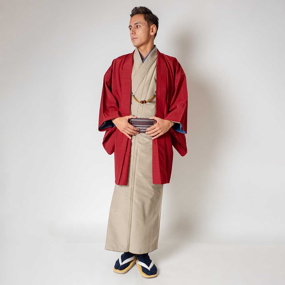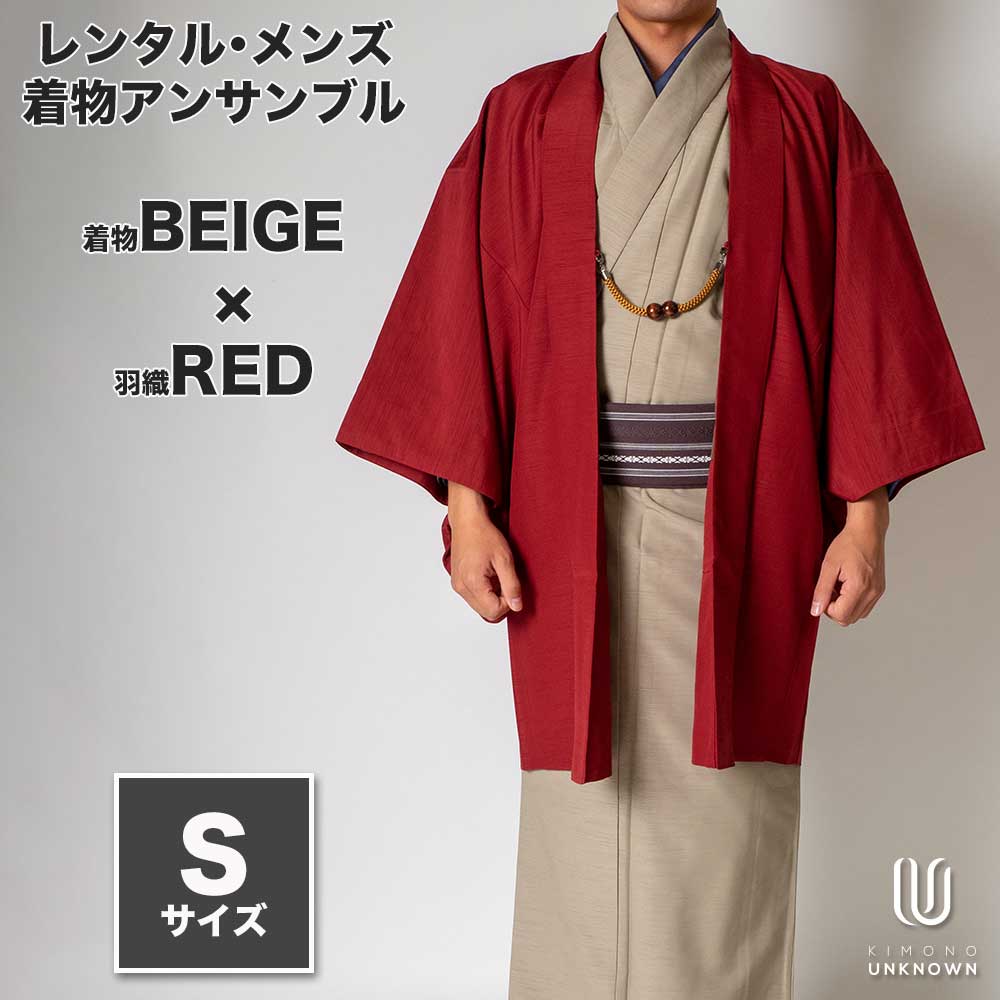 メンズ着物アンサンブル【対応身長160cm~170cm】【 Sサイズ】フルセットー着物ベージュ×羽織レッド 着流し 羽織 パパ着物 父親 春 秋 冬 着付け簡単 おしゃれ着 カジュアル 貸衣装 レンタル衣裳