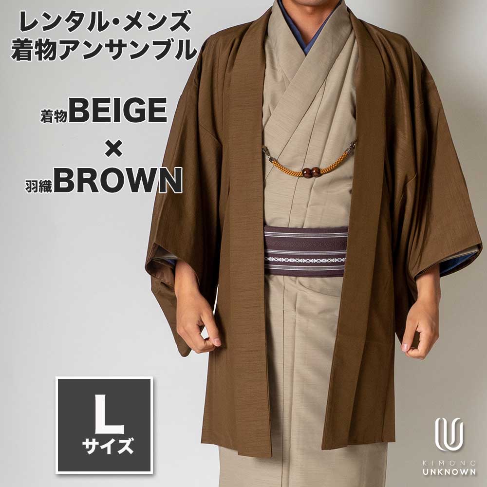 メンズ着物アンサンブル【対応身長170cm~180cm】【 Lサイズ】フルセットー着物ベージュ×羽織ブラウン 着流し 羽織 パパ着物 父親 春 秋 冬 着付け簡単 おしゃれ着 カジュアル 貸衣装 レンタル衣