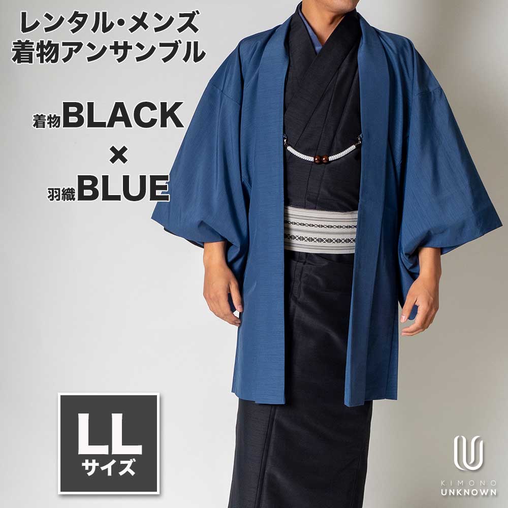 メンズ着物アンサンブル【対応身長175cm~185cm】【 LLサイズ】フルセットー着物ブラック×羽織ブルー 着流し 羽織 パパ着物 父親 春 秋 冬 着付け簡単 おしゃれ着 カジュアル 貸衣装 レンタル衣