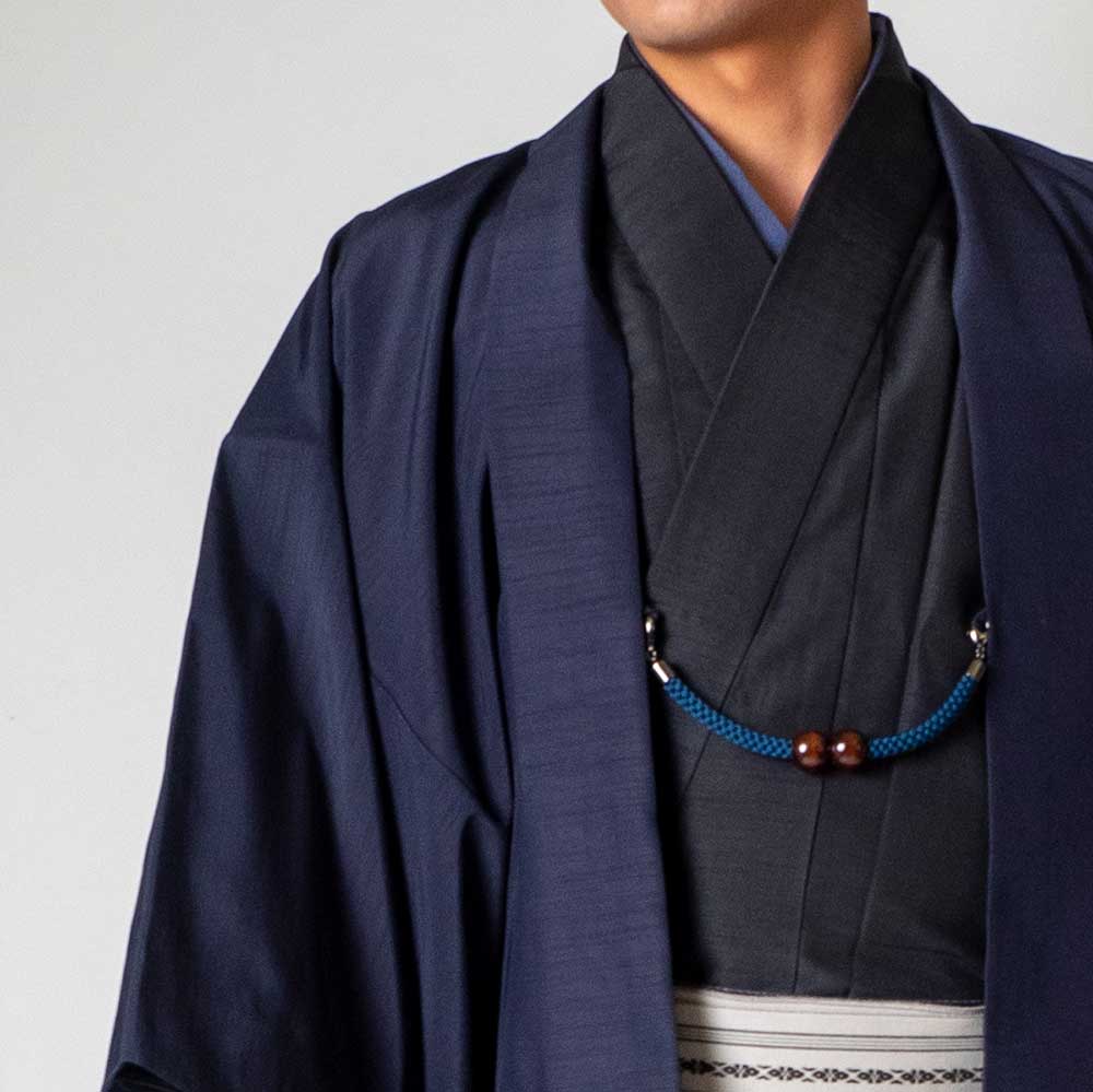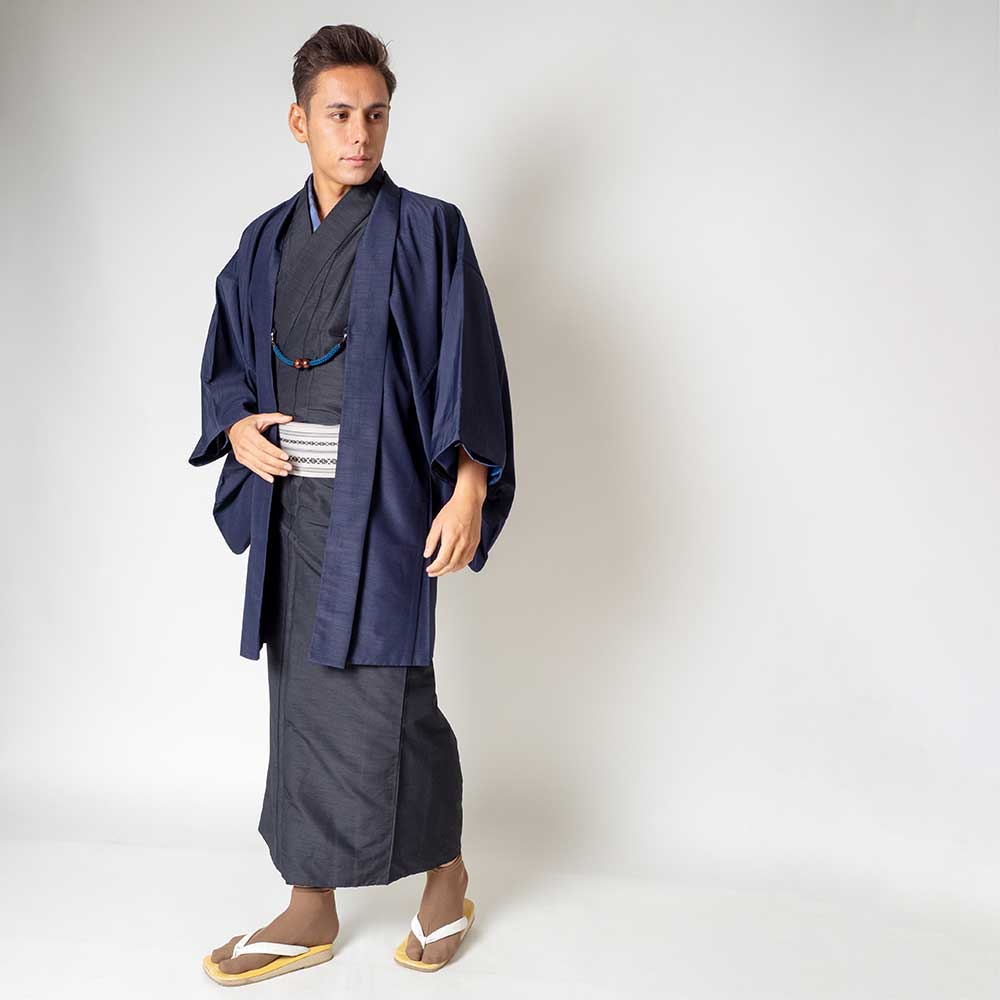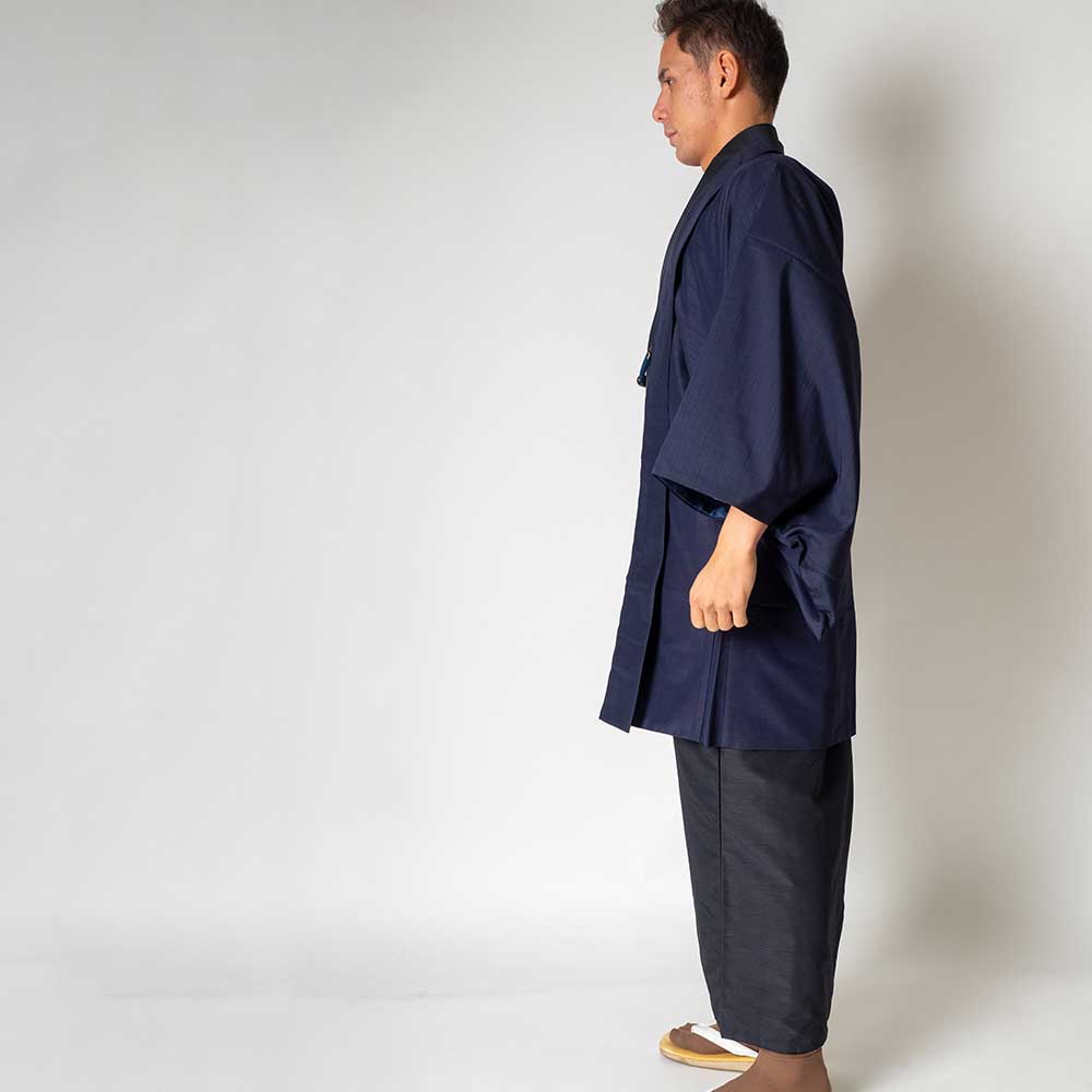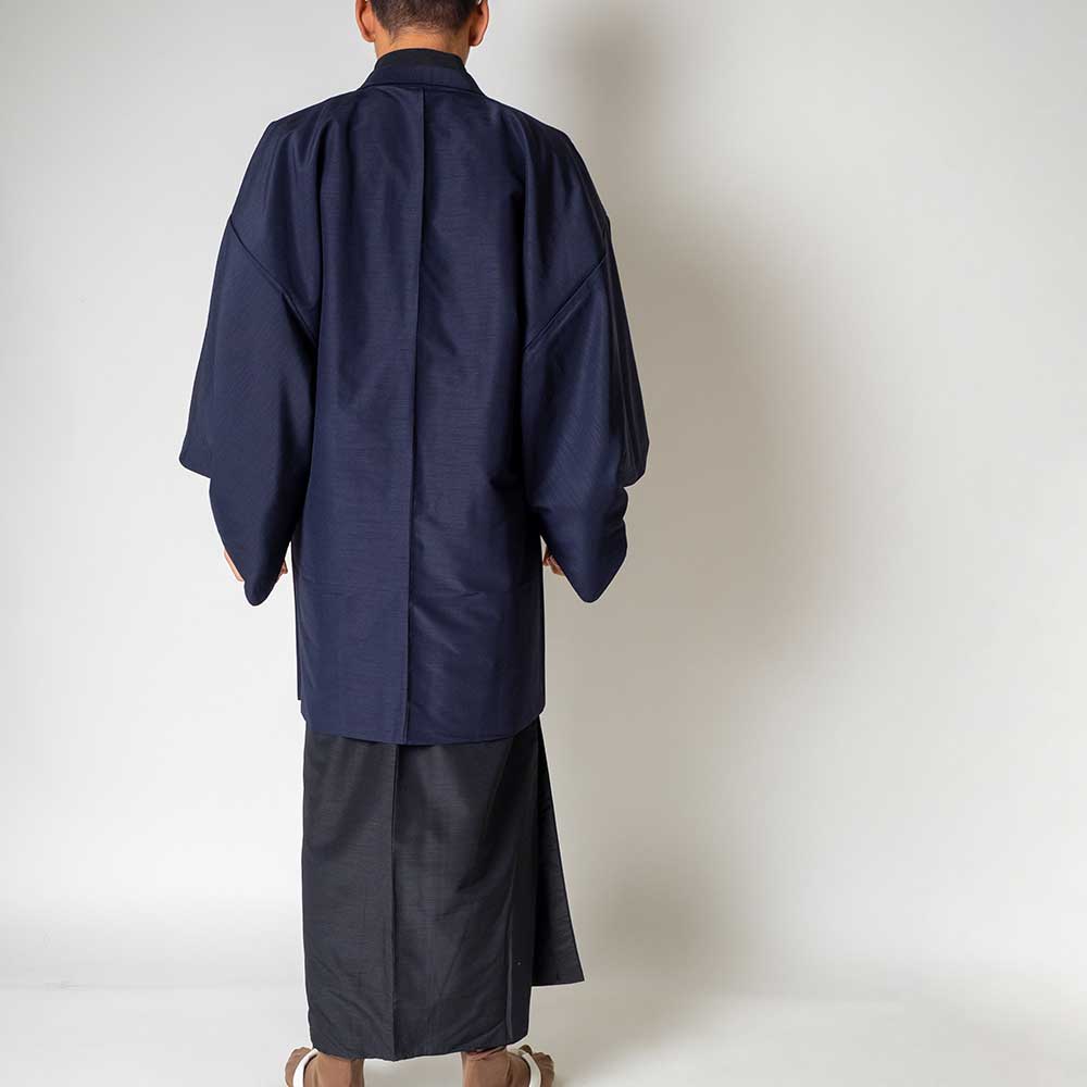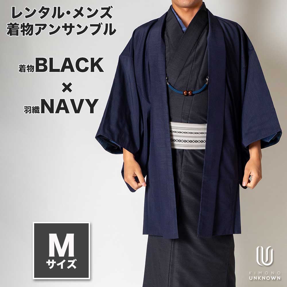 メンズ着物アンサンブル【対応身長165cm~175cm】【 Mサイズ】フルセットー着物ブラック×羽織ネイビー 着流し 羽織 パパ着物 父親 春 秋 冬 着付け簡単 おしゃれ着 カジュアル 貸衣装 レンタル衣