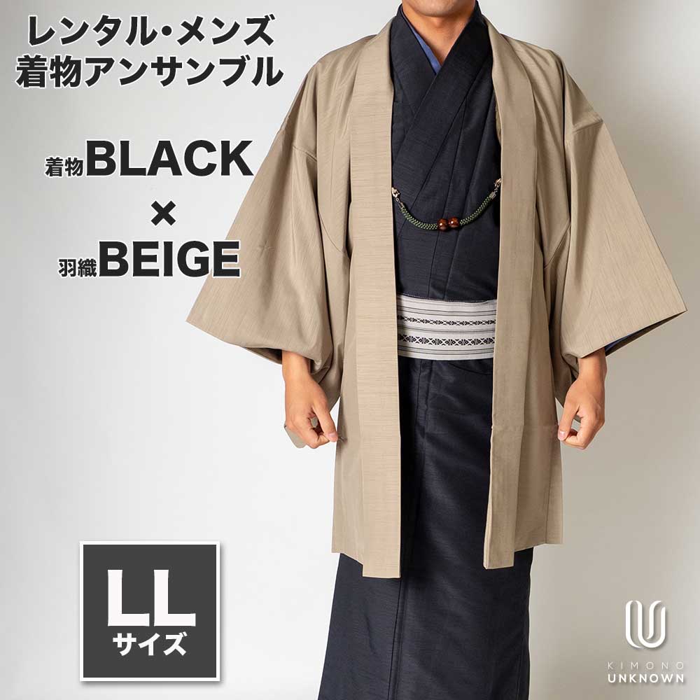 メンズ着物アンサンブル【対応身長175cm~185cm】【 LLサイズ】フルセットー着物ブラック×羽織ベージュ 着流し 羽織 パパ着物 父親 春 秋 冬 着付け簡単 おしゃれ着 カジュアル 貸衣装 レンタル