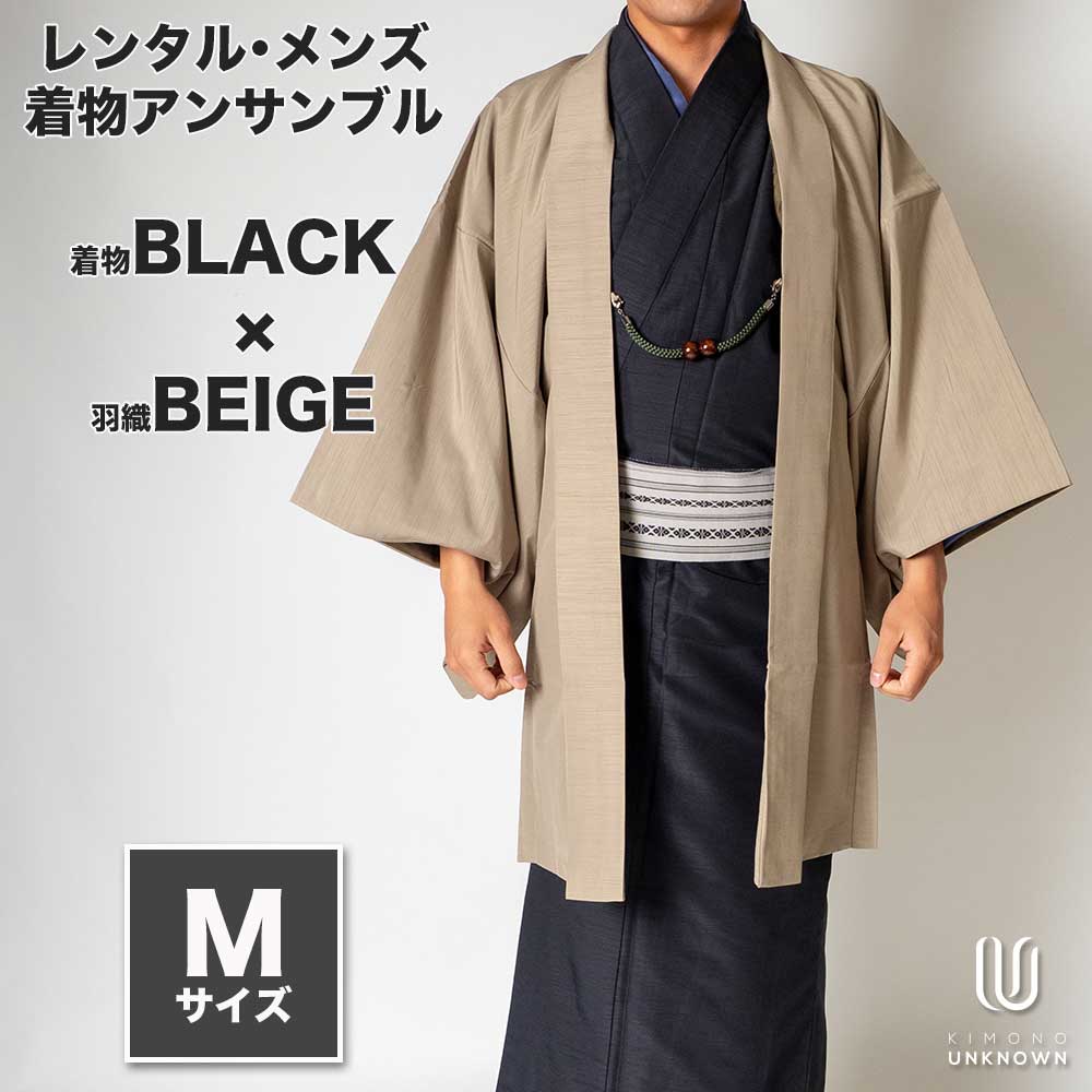 メンズ着物アンサンブル【対応身長165cm~175cm】【 Mサイズ】フルセットー着物ブラック×羽織ベージュ 着流し 羽織 パパ着物 父親 春 秋 冬 着付け簡単 おしゃれ着 カジュアル 貸衣装 レンタル衣