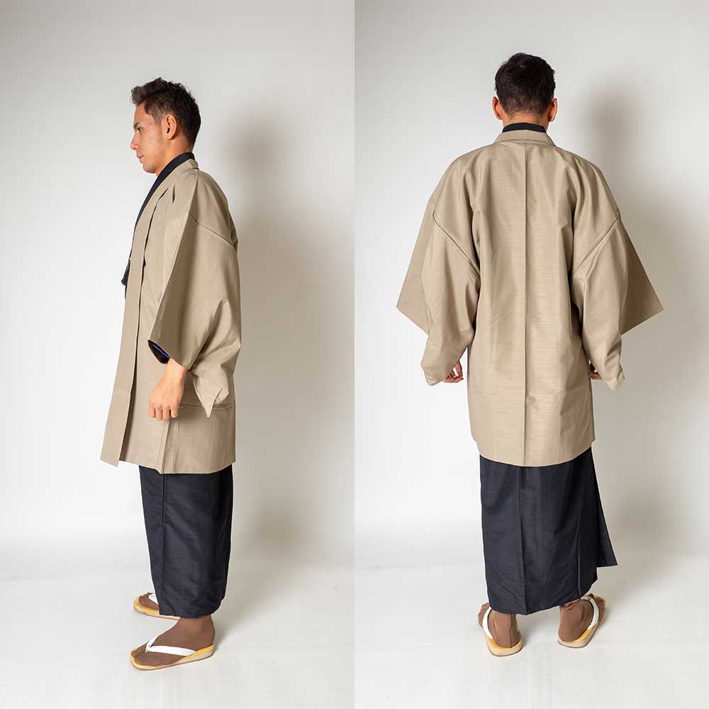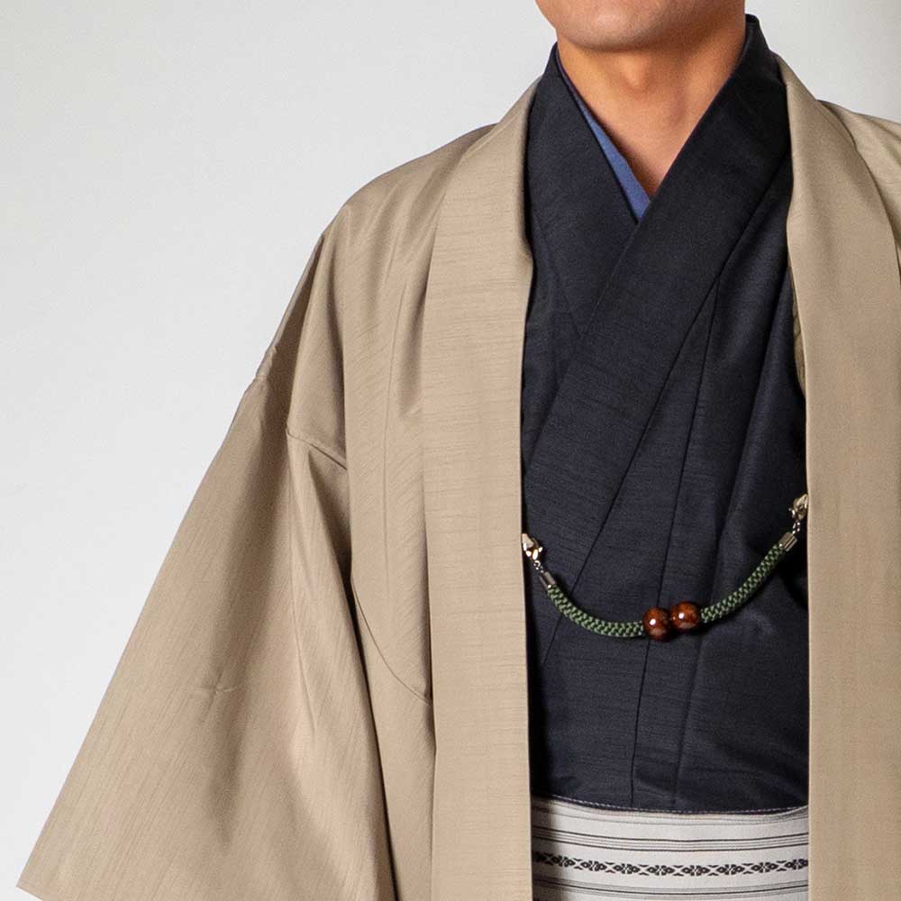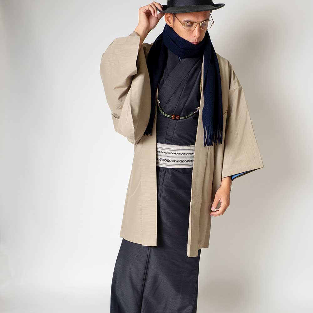 メンズ着物アンサンブル【対応身長160cm~170cm】【 Sサイズ】フルセットー着物ブラック×羽織ベージュ 着流し 羽織 パパ着物 父親 春 秋 冬 着付け簡単 おしゃれ着 カジュアル 貸衣装 レンタル衣