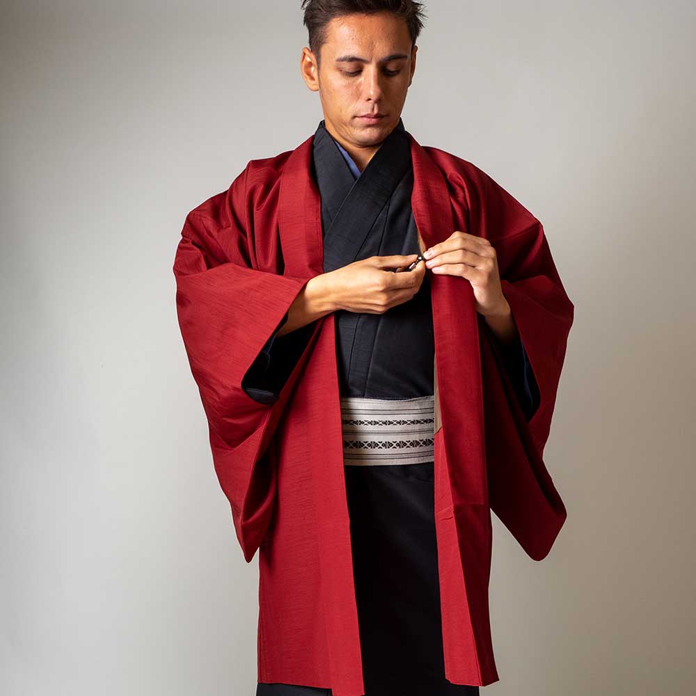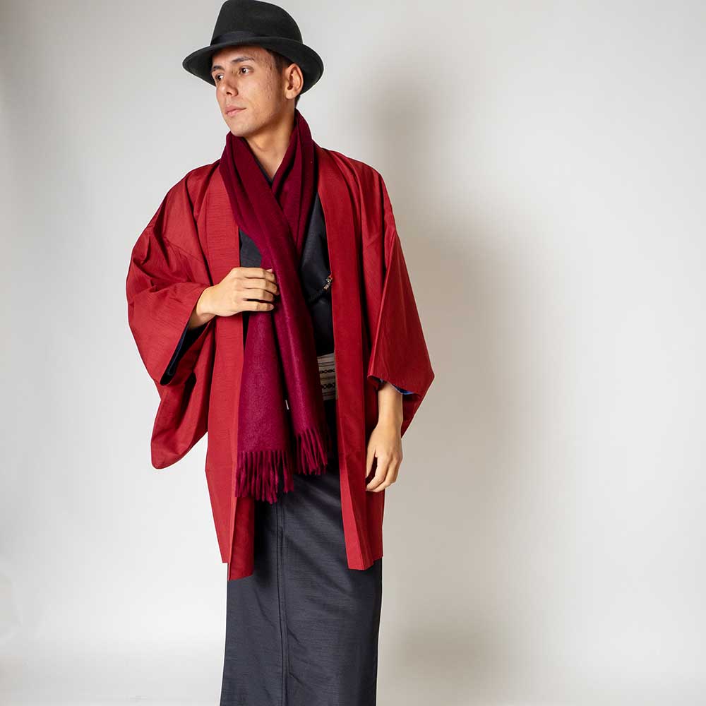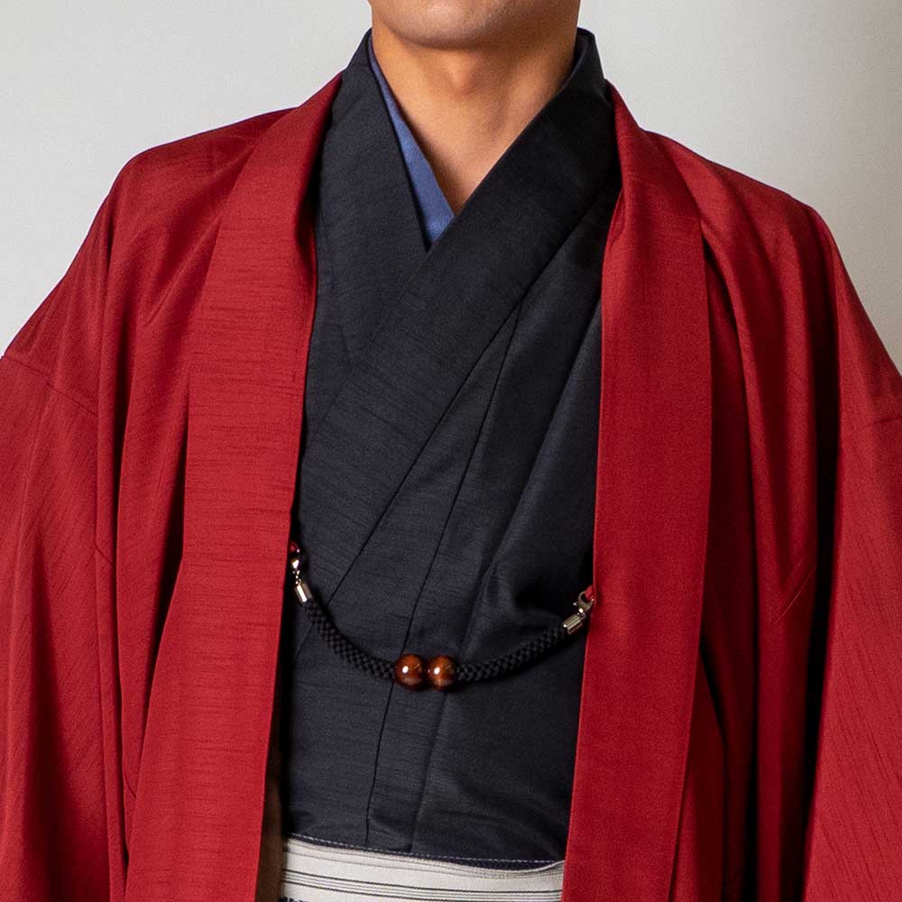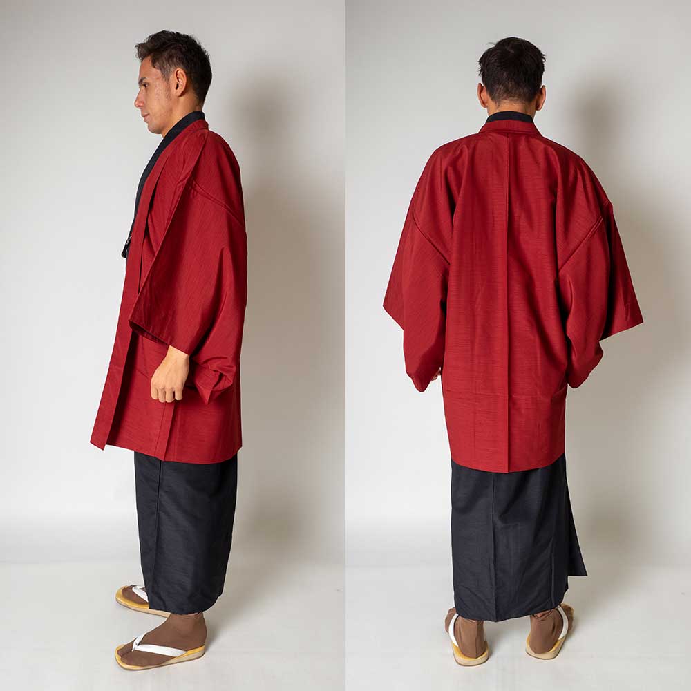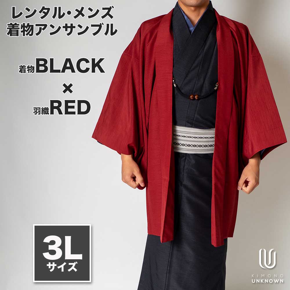 メンズ着物アンサンブル【対応身長180cm~190cm】【 3Lサイズ】フルセットー着物ブラック×羽織レッド 着流し 羽織 パパ着物 父親 春 秋 冬 着付け簡単 おしゃれ着 カジュアル 貸衣装 レンタル衣