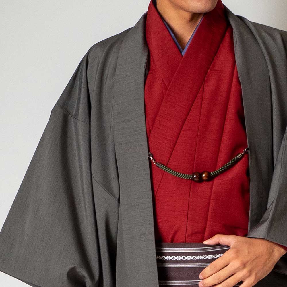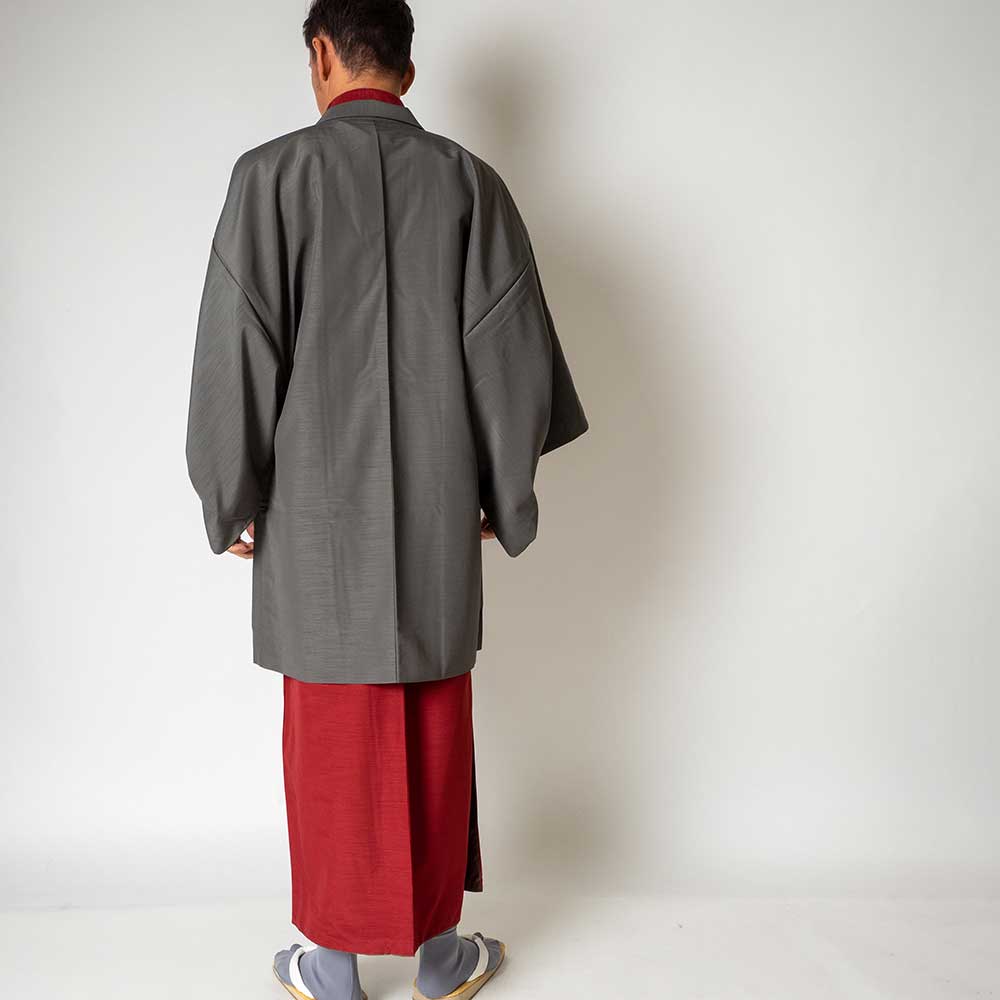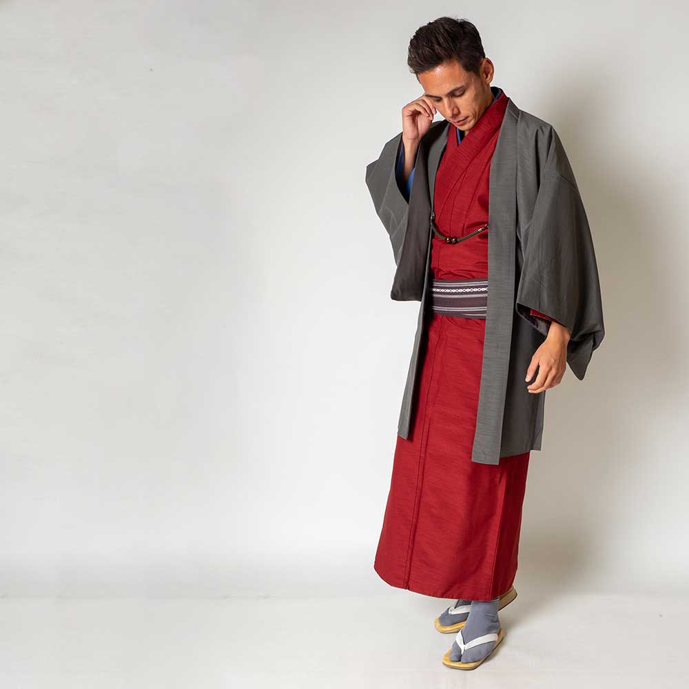メンズ着物アンサンブル【対応身長180cm~190cm】【 3Lサイズ】フルセットー着物レッド×羽織グレー 着流し 羽織 パパ着物 父親 春 秋 冬 着付け簡単 カジュアル 貸衣装 レンタル衣裳 七五三 お正月 初詣 旅行 食事会 成人式 家族写真 卒業式