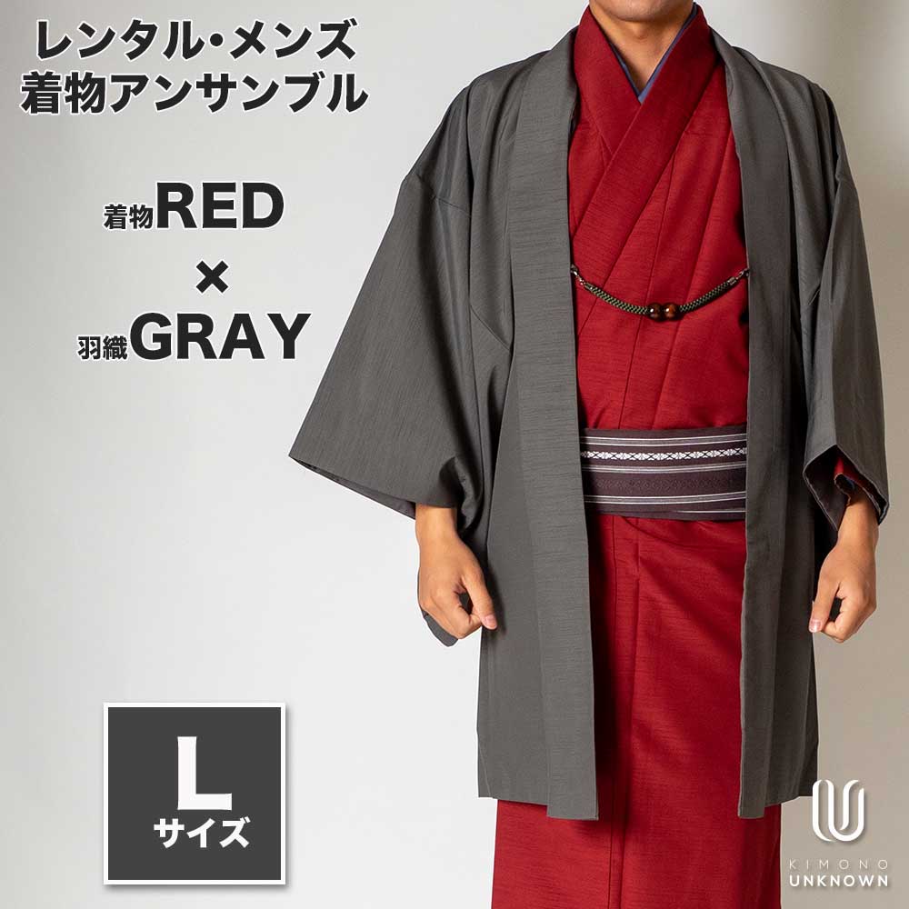 メンズ着物アンサンブル【対応身長170cm~180cm】【 Lサイズ】フルセットー着物レッド×羽織グレー 春 秋 冬 おしゃれ着 カジュアル 貸衣装 レンタル衣裳 七五三 お正月 初詣