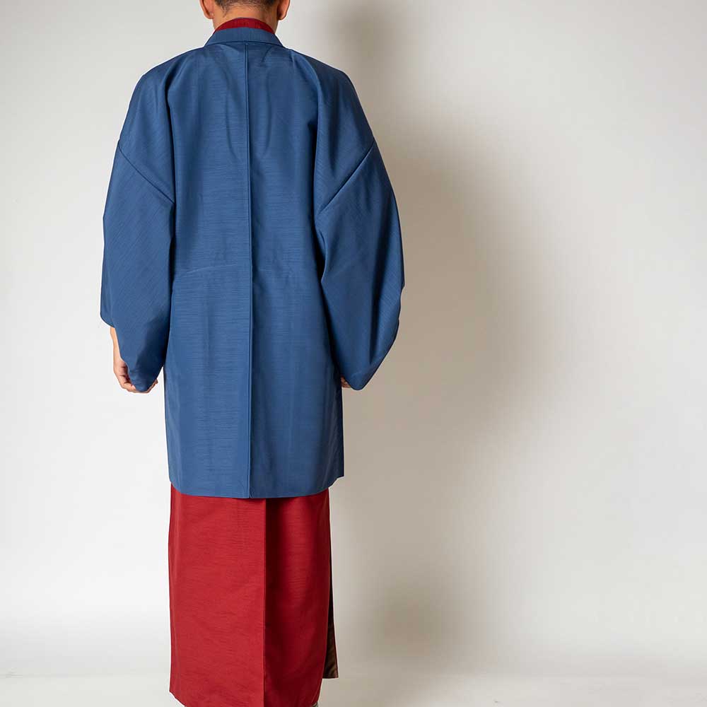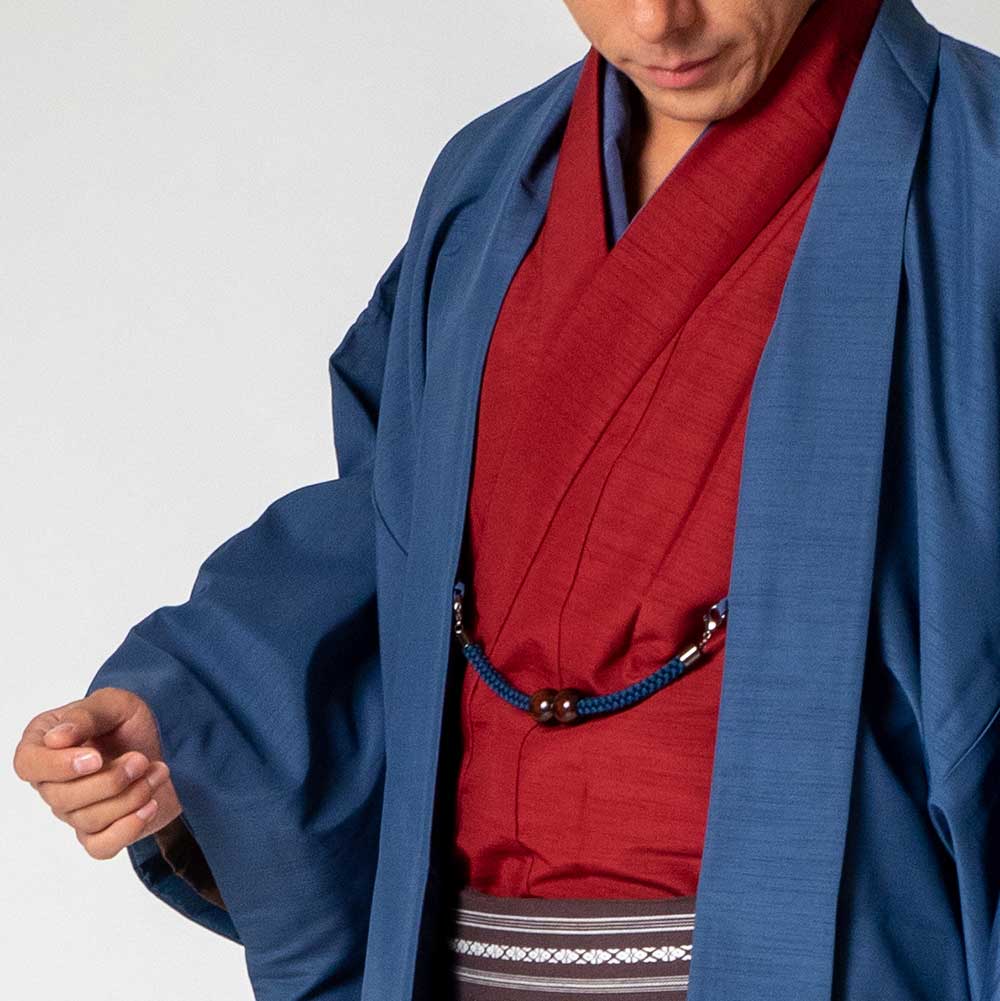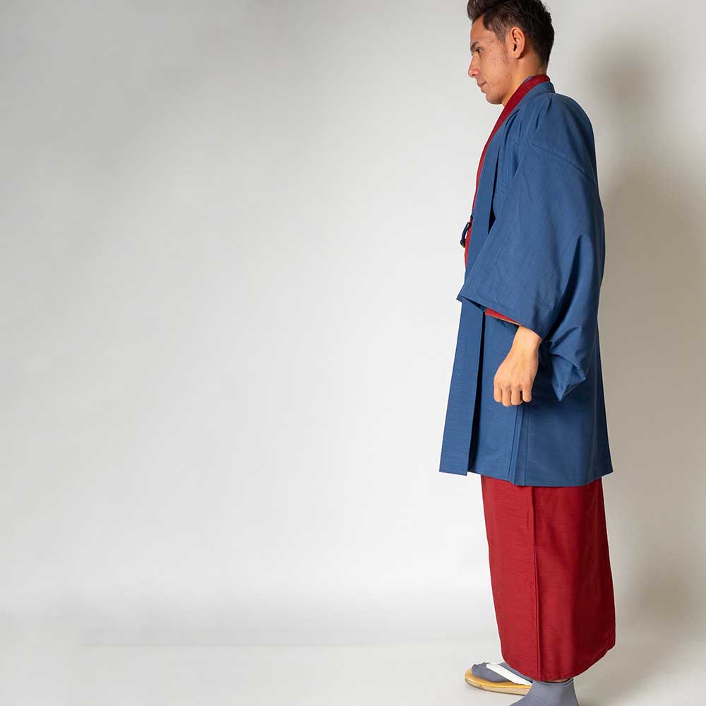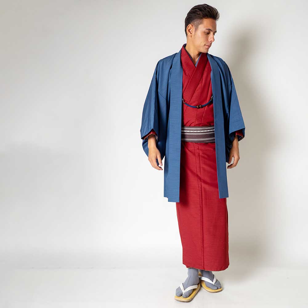 メンズ着物アンサンブル【対応身長175cm~185cm】【 LLサイズ】フルセットー着物レッド×羽織ブルー 春 秋 冬 おしゃれ着 カジュアル 貸衣装 レンタル衣裳 七五三 お正月 初詣