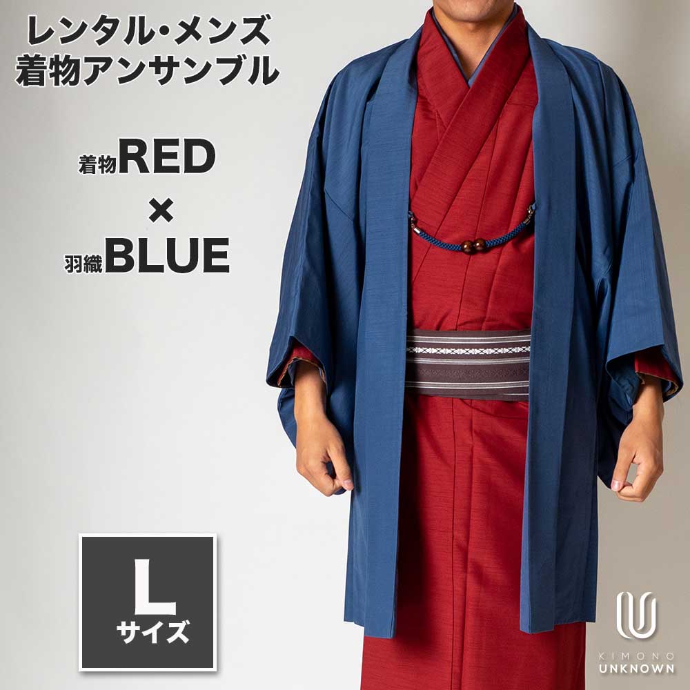 メンズ着物アンサンブル【対応身長170cm~180cm】【 Lサイズ】フルセットー着物レッド×羽織ブルー 春 秋 冬 おしゃれ着 カジュアル 貸衣装 レンタル衣裳 七五三 お正月 初詣