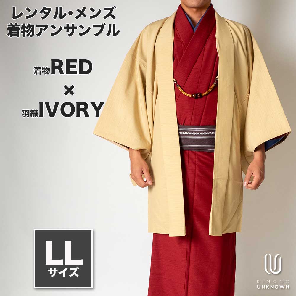 メンズ着物アンサンブル 【対応身長175cm~185cm】【LLサイズ】 フルセット 着物レッド×羽織アイボリー 着流し 羽織 パパ着物 父親 春 秋 冬 着付け簡単 貸衣装 レンタル衣裳 七五三 お正月 初詣 旅行 食事会 男性用着物 カジュアル着物