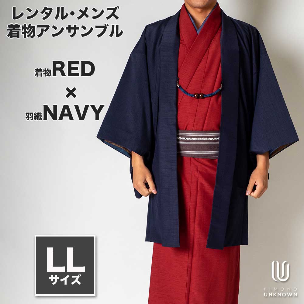 メンズ着物アンサンブル【対応身長175cm~185cm】【 LLサイズ】フルセットー着物レッド×羽織ネイビー 着流し 羽織 パパ着物 父親 春 秋 冬 着付け簡単 おしゃれ着 カジュアル 貸衣装 レンタル衣