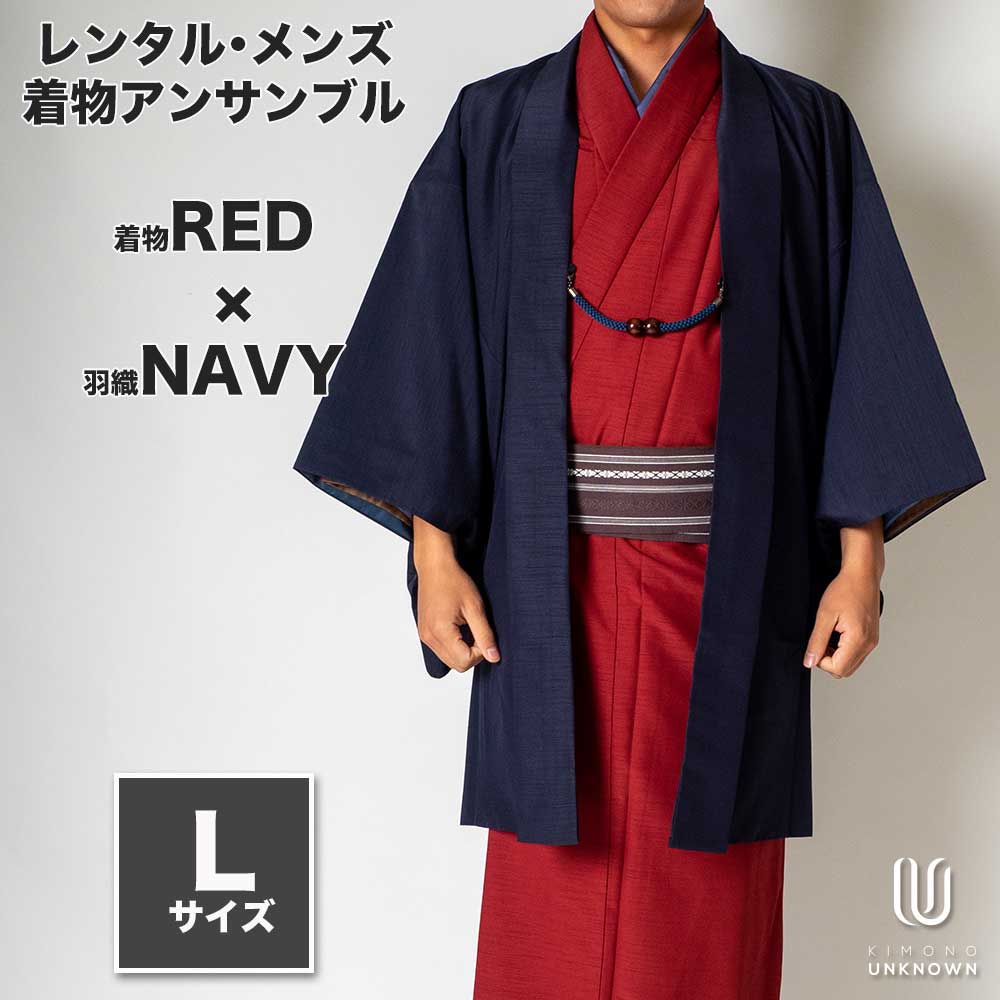 メンズ着物アンサンブル【対応身長170cm~180cm】【 Lサイズ】フルセットー着物レッド×羽織ネイビー 着流し 羽織 パパ着物 父親 春 秋 冬 着付け簡単 おしゃれ着 カジュアル 貸衣装 レンタル衣裳