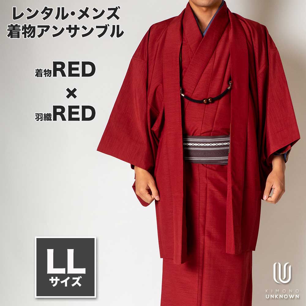 メンズ着物アンサンブル【対応身長175cm~185cm】【 LLサイズ】フルセットー着物レッド×羽織レッド 春 秋 冬 おしゃれ着 カジュアル 貸衣装 レンタル衣裳 七五三 お正月 初詣