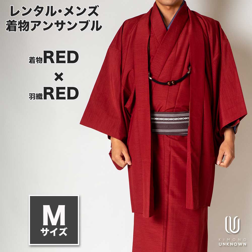 メンズ着物アンサンブル【対応身長165cm~175cm】【 Mサイズ】フルセットー着物レッド×羽織レッド 春 秋 冬 おしゃれ着 カジュアル 貸衣装 レンタル衣裳 七五三 お正月 初詣