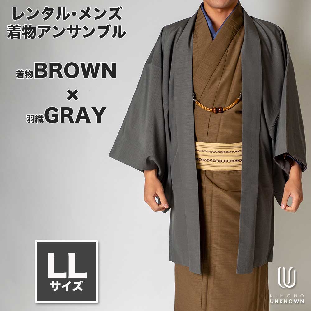 メンズ着物アンサンブル【対応身長175cm~185cm】【 LLサイズ】フルセットー着物ブラウン×羽織グレー 着流し 羽織 パパ着物 父親 春 秋 冬 着付け簡単 おしゃれ着 カジュアル 貸衣装 レンタル衣
