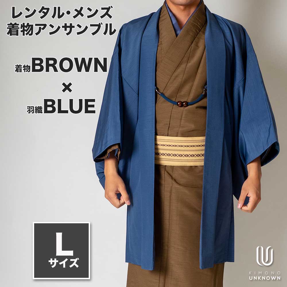 メンズ着物アンサンブル【対応身長170cm~180cm】【 Lサイズ】フルセットー着物ブラウン×羽織ブルー 着流し 羽織 パパ着物 父親 春 秋 冬 着付け簡単 おしゃれ着 カジュアル 貸衣装 レンタル衣裳