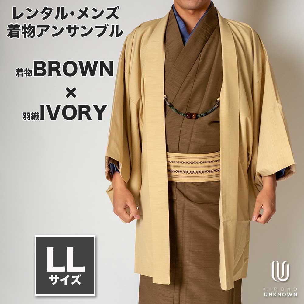 メンズ着物アンサンブル【対応身長175cm~185cm】【 LLサイズ】フルセットー着物ブラウン×羽織アイボリー 着流し 羽織 パパ着物 父親 春 秋 冬 着付け簡単 おしゃれ着 カジュアル 貸衣装 レンタ