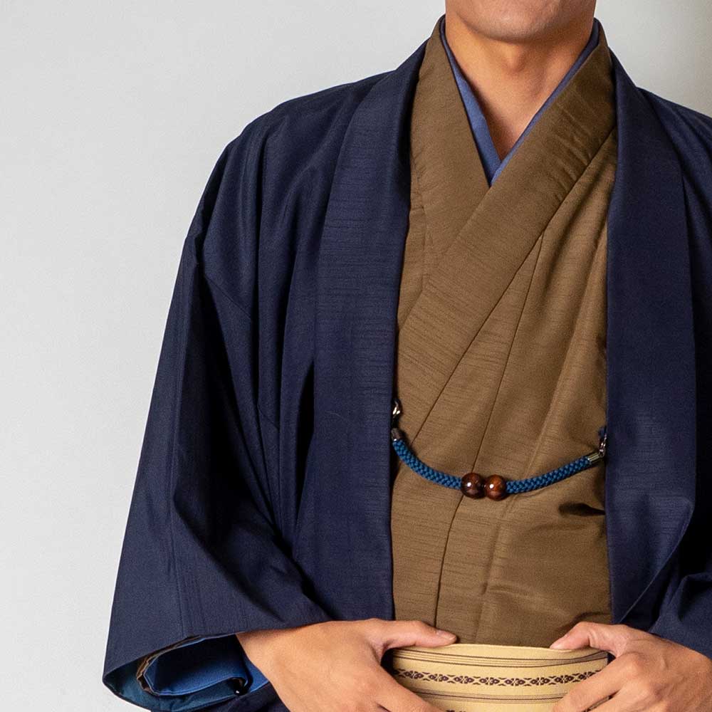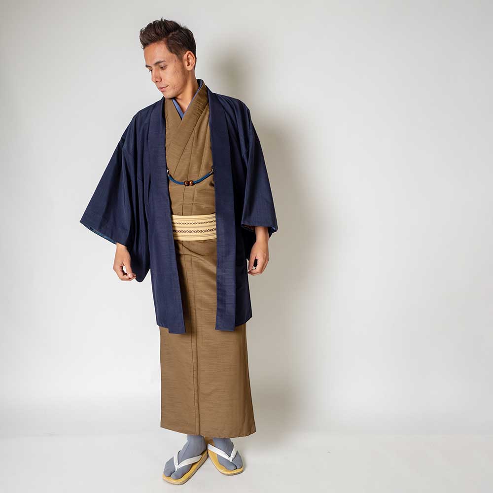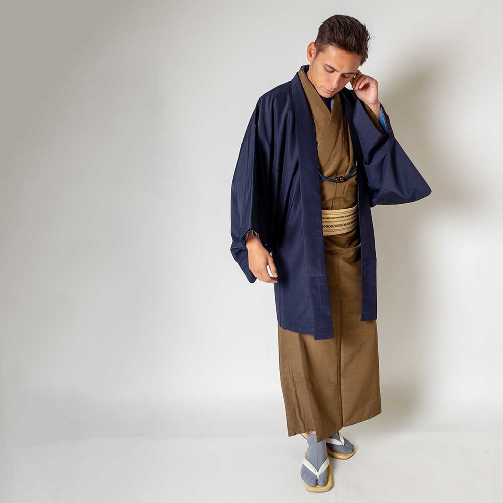 メンズ着物アンサンブル【対応身長165cm~175cm】【 Mサイズ】フルセットー着物ブラウン×羽織ネイビー 着流し 羽織 パパ着物 父親 春 秋 冬 着付け簡単 おしゃれ着 カジュアル 貸衣装 レンタル衣