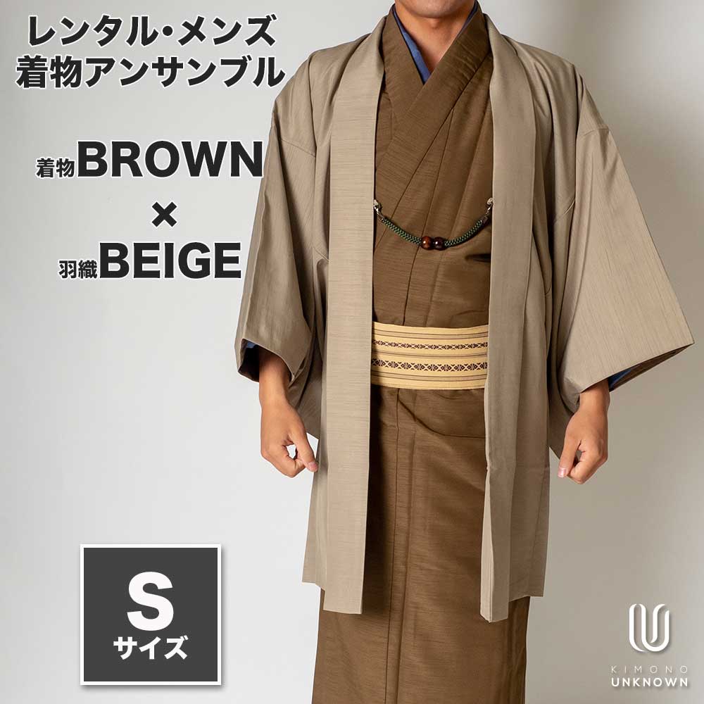 メンズ着物アンサンブル【対応身長160cm~170cm】【 Sサイズ】フルセットー着物ブラウン×羽織ベージュ 着流し 羽織 パパ着物 父親 春 秋 冬 着付け簡単 おしゃれ着 カジュアル 貸衣装 レンタル衣