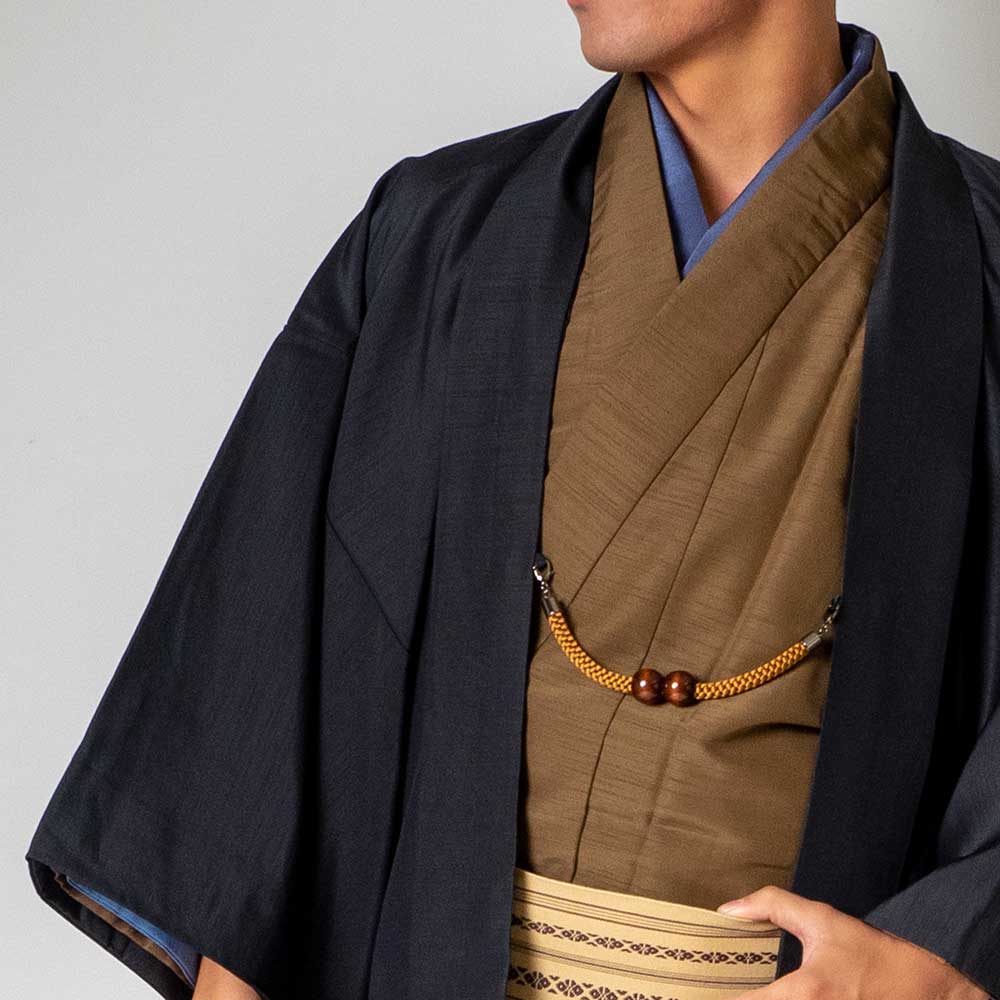 メンズ着物アンサンブル【対応身長170cm~180cm】【 Lサイズ】フルセットー着物ブラウン×羽織ブラック 着流し 羽織 パパ着物 父親 春 秋 冬 着付け簡単 おしゃれ着 カジュアル 貸衣装 レンタル衣