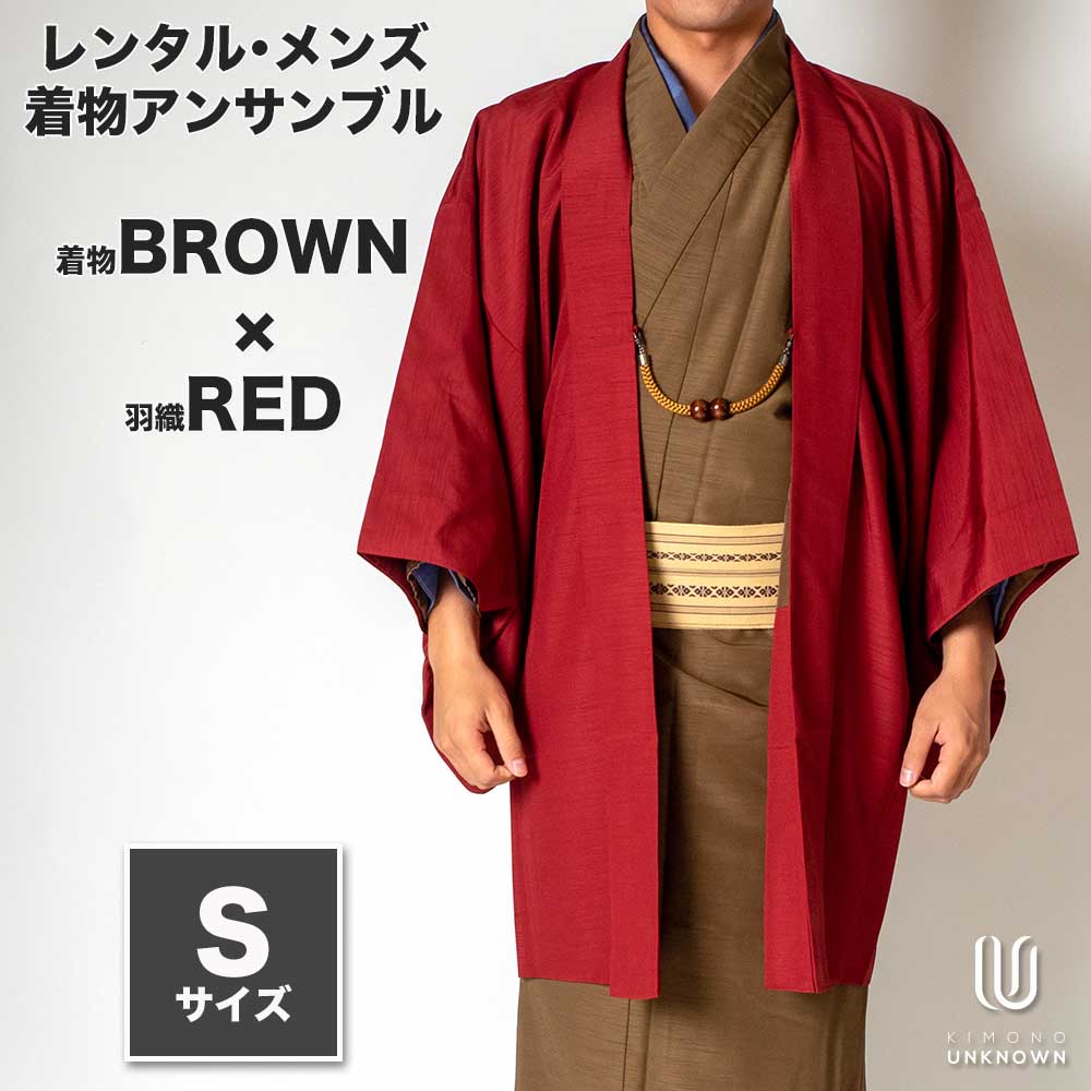 メンズ着物アンサンブル【対応身長160cm~170cm】【 Sサイズ】フルセットー着物ブラウン×羽織レッド 着流し 羽織 パパ着物 父親 春 秋 冬 着付け簡単 おしゃれ着 カジュアル 貸衣装 レンタル衣裳