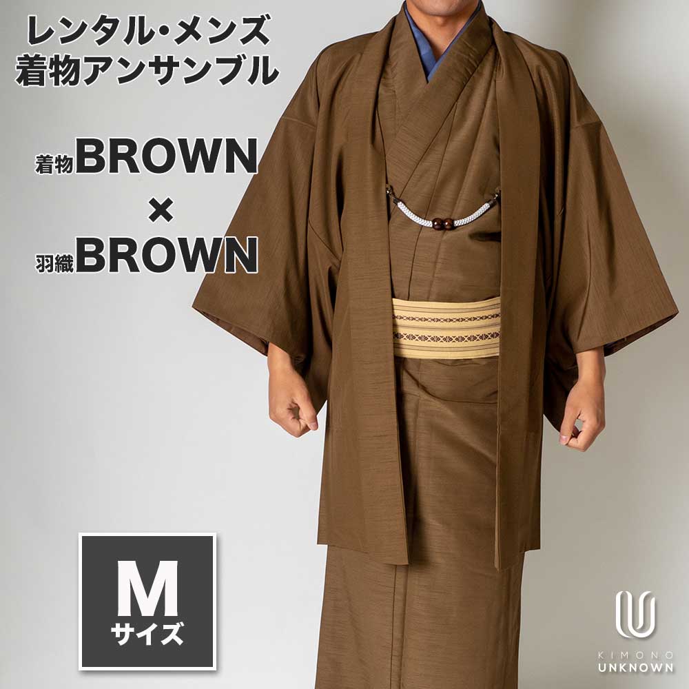メンズ着物アンサンブル【対応身長165cm~175cm】【 Mサイズ】フルセットー着物ブラウン×羽織ブラウン 着流し 羽織 パパ着物 父親 春 秋 冬 着付け簡単 おしゃれ着 カジュアル 貸衣装 レンタル衣